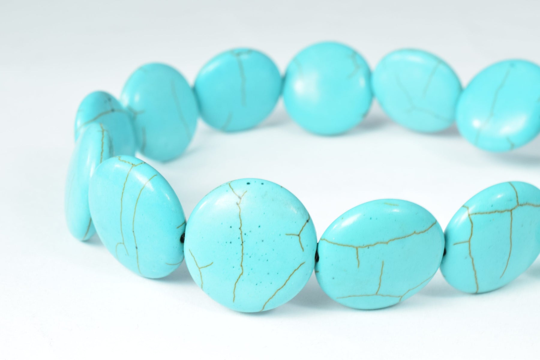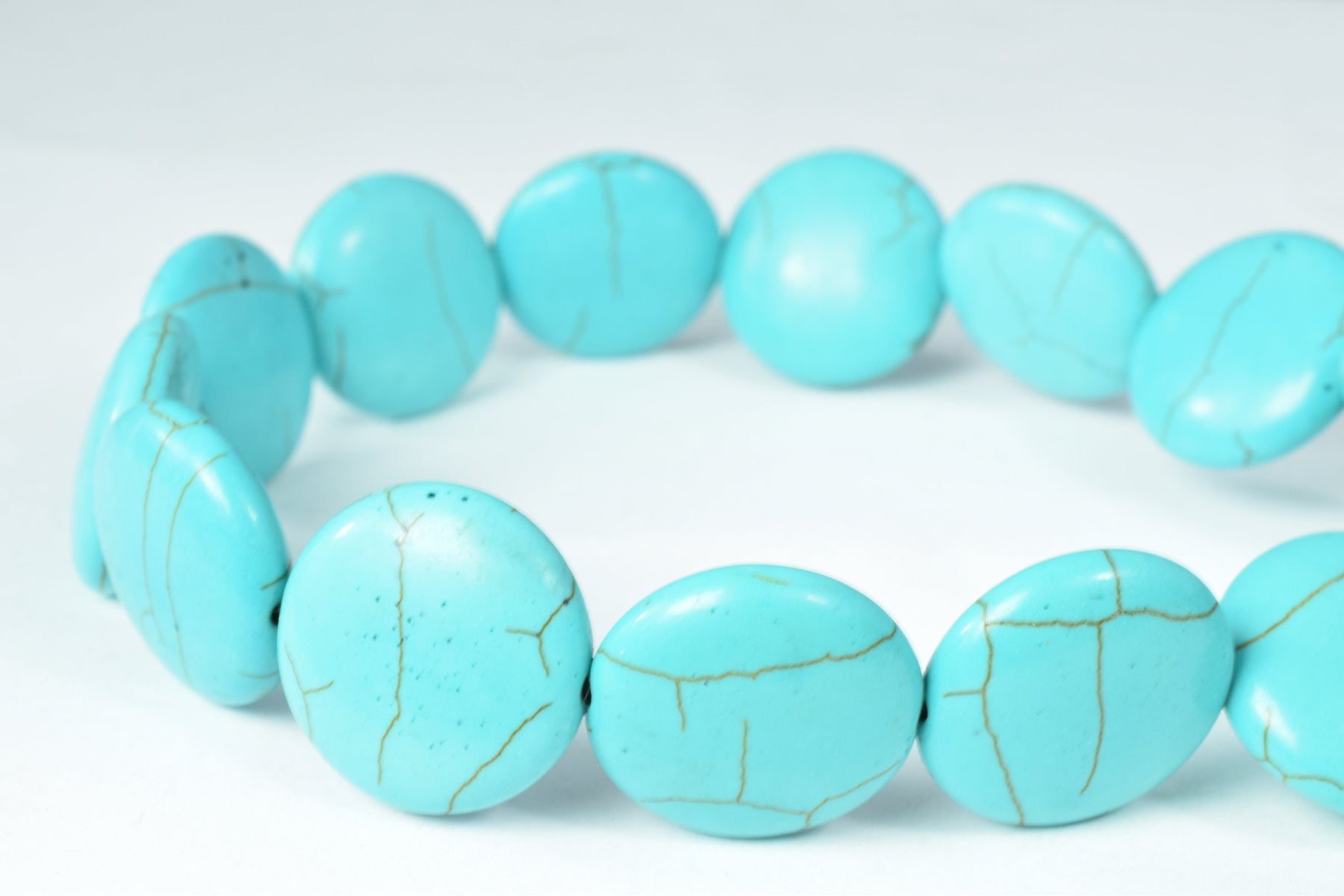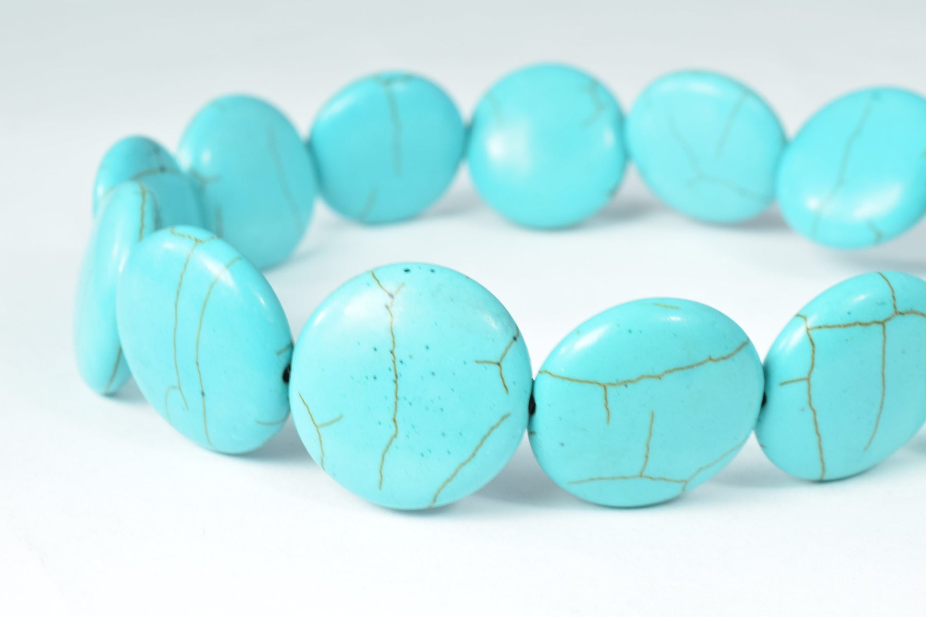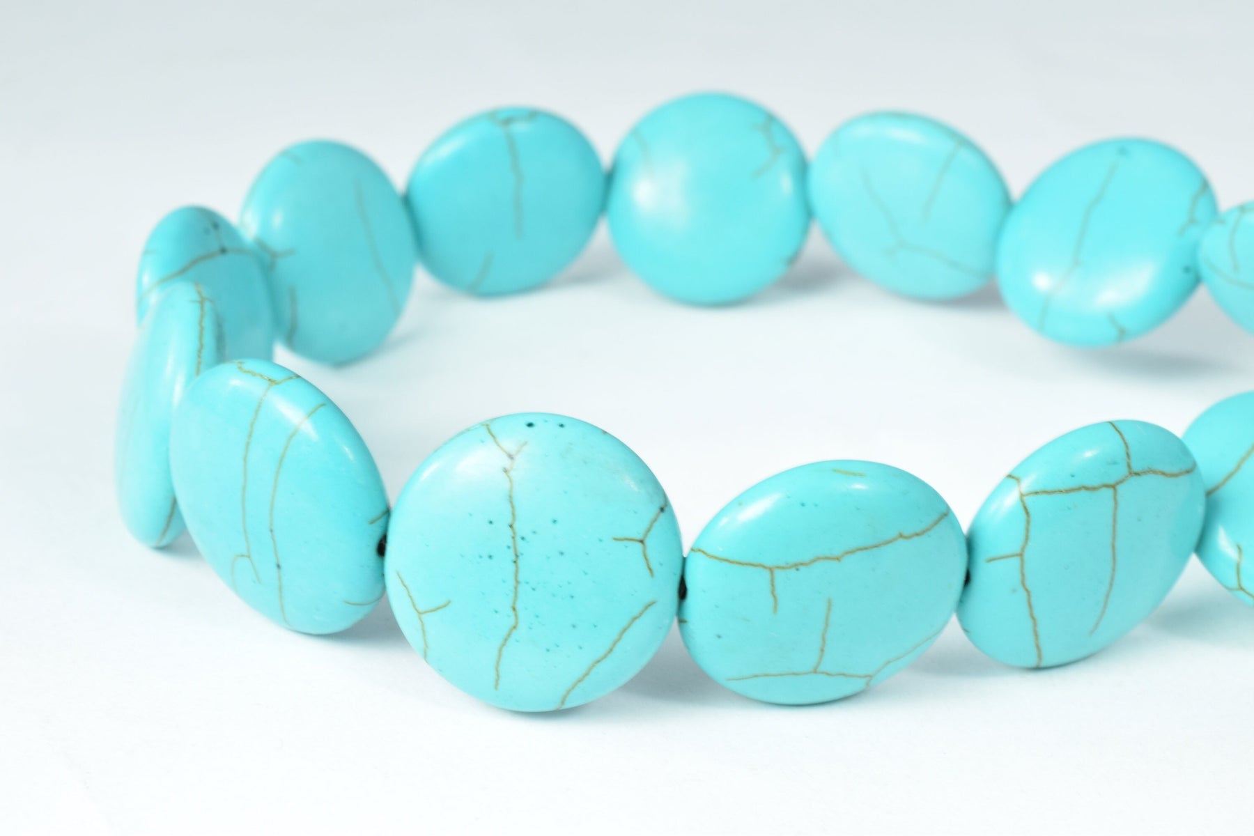 Details: 16mm Turquoise round flat beads/ 27pcs/beautiful beads/gemstone beading supplies great for designing high quality jewelry/1mm hole opening/8mm bead thickness/ 1.5mm hole opening