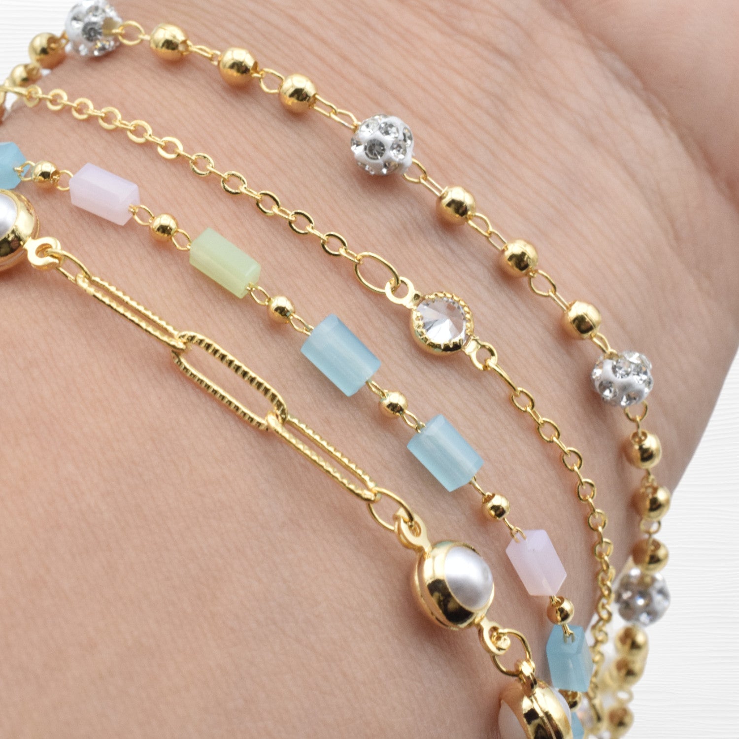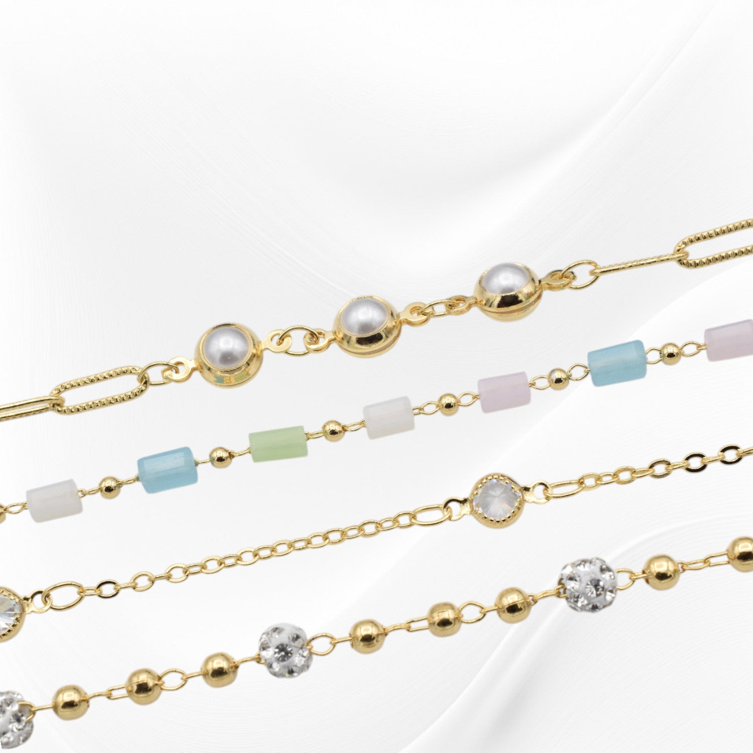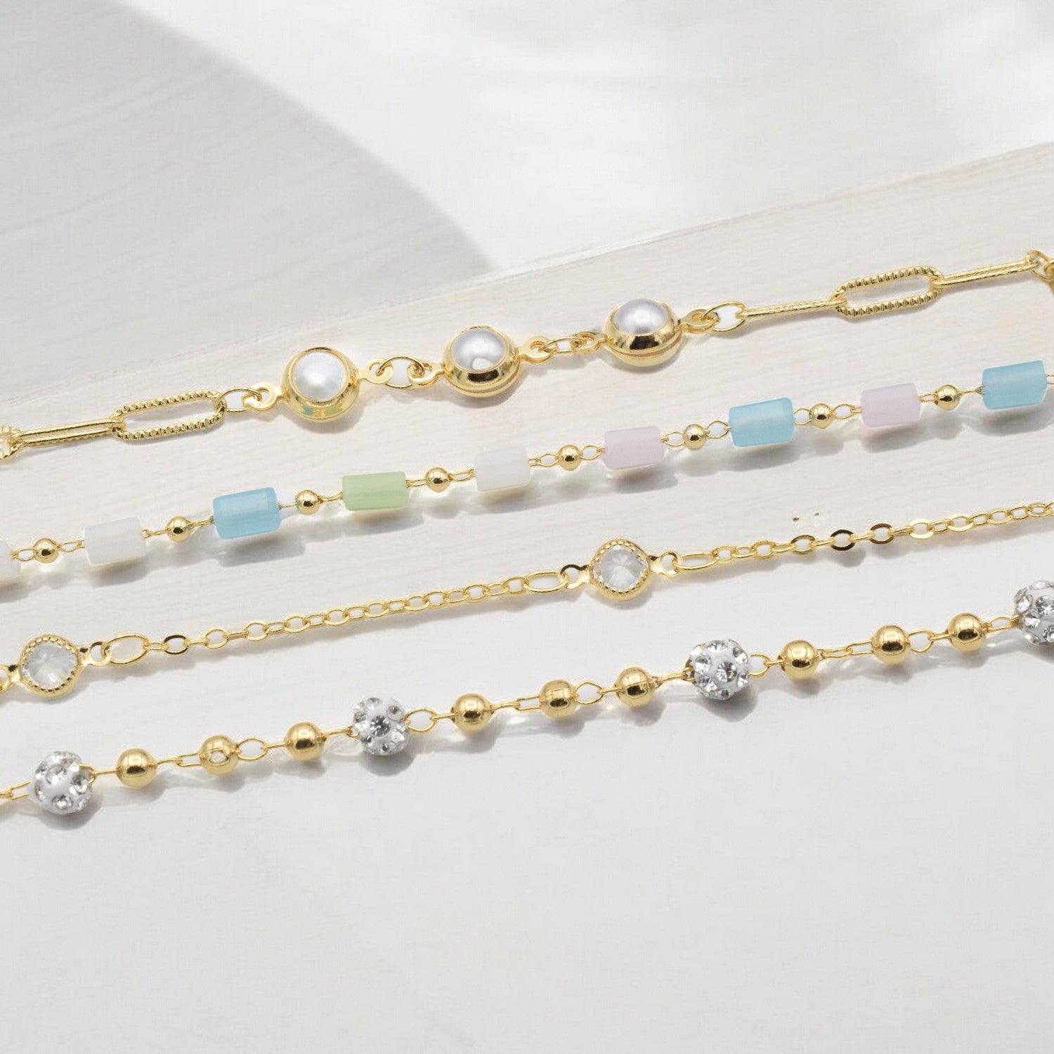 "Set of four gold delicate bracelets with pearls, colorful beads, and crystals on light background"