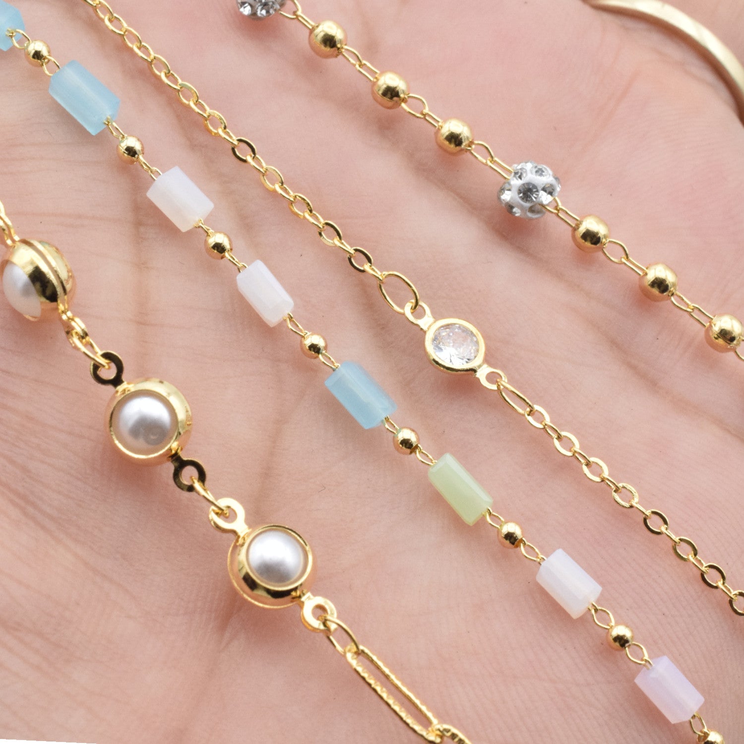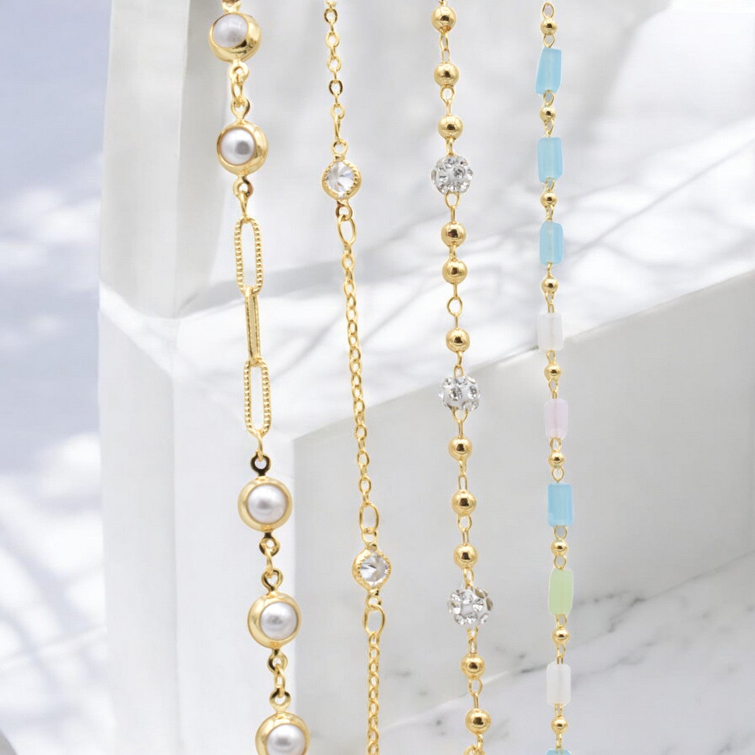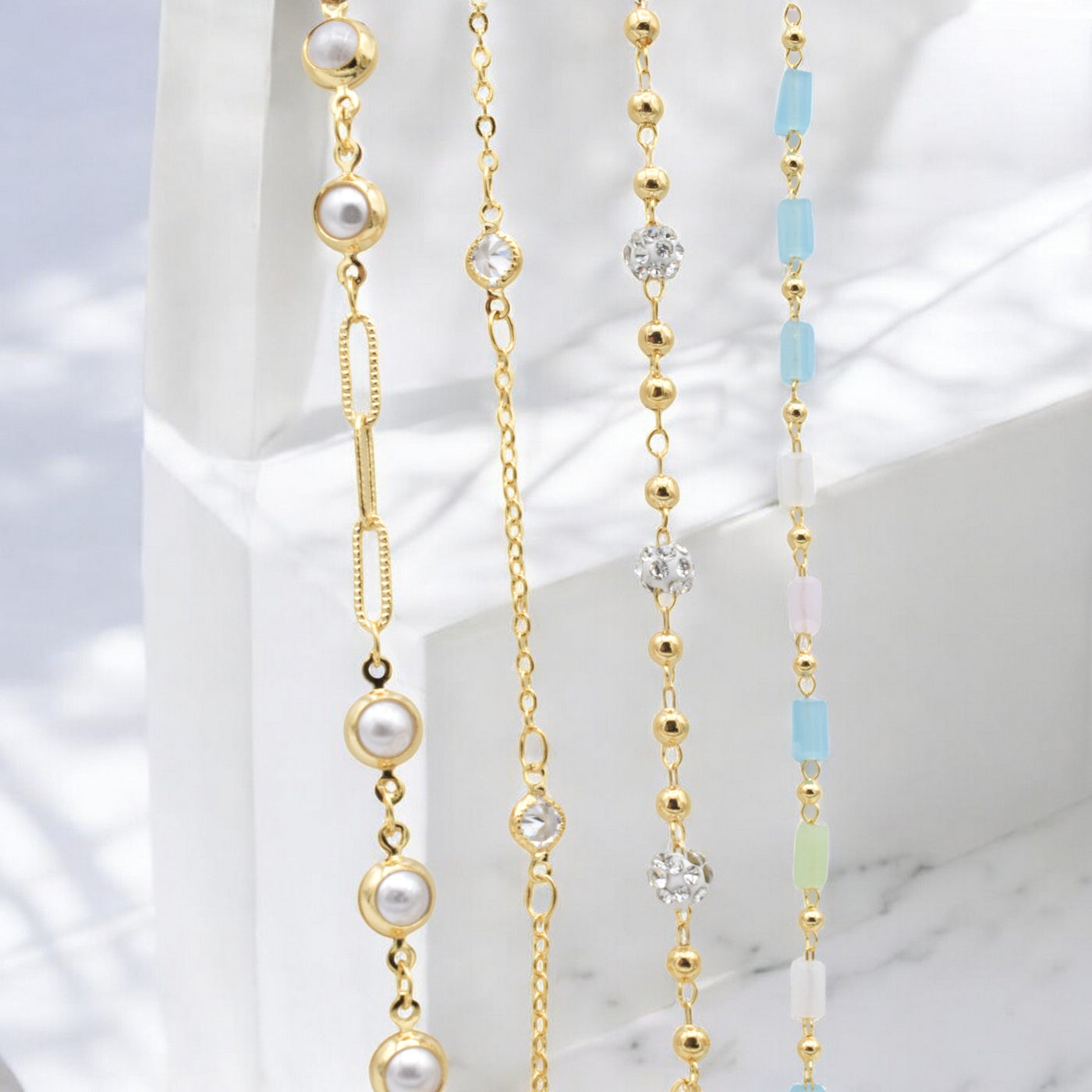 "Set of four gold delicate bracelets with pearls, colorful beads, and crystals on light background"