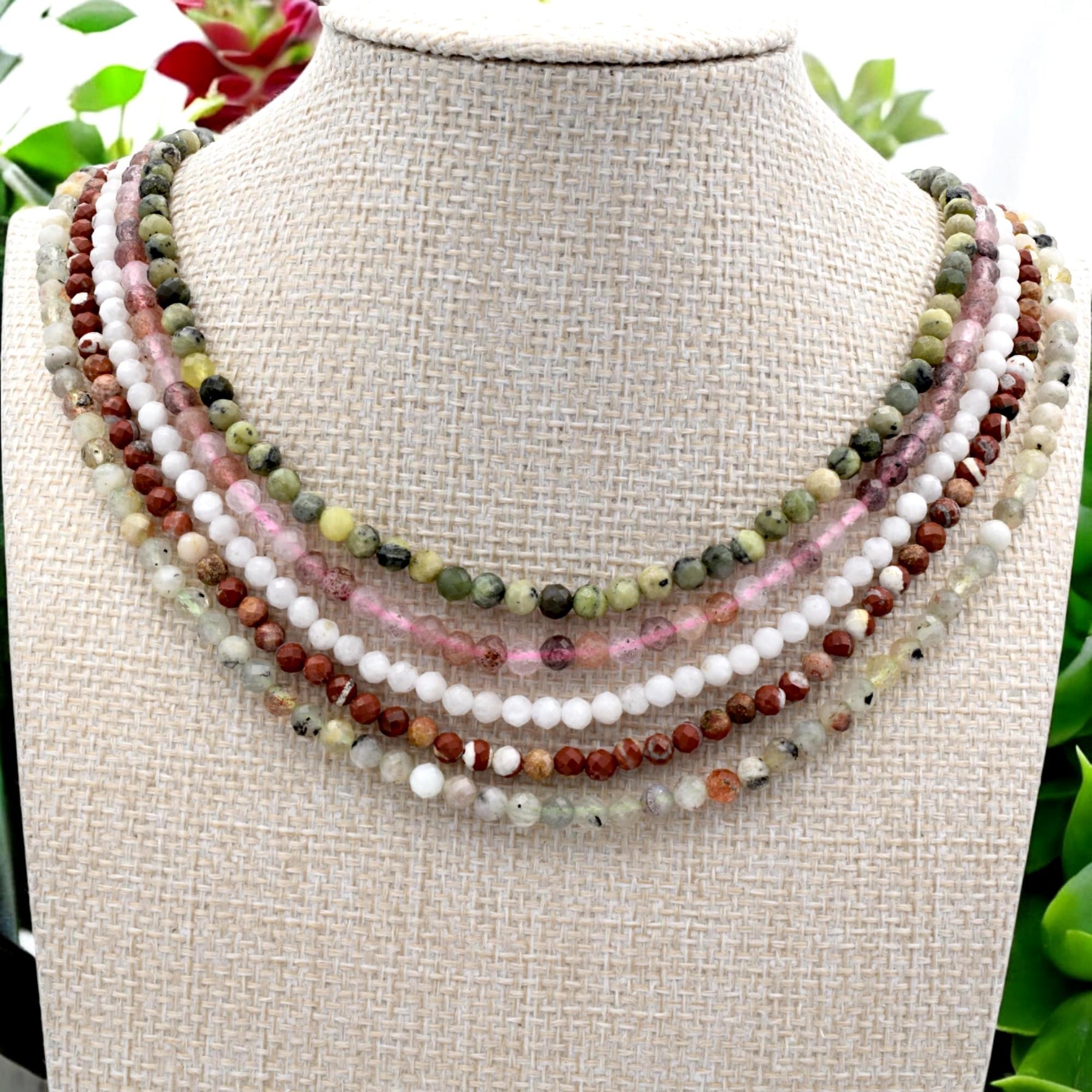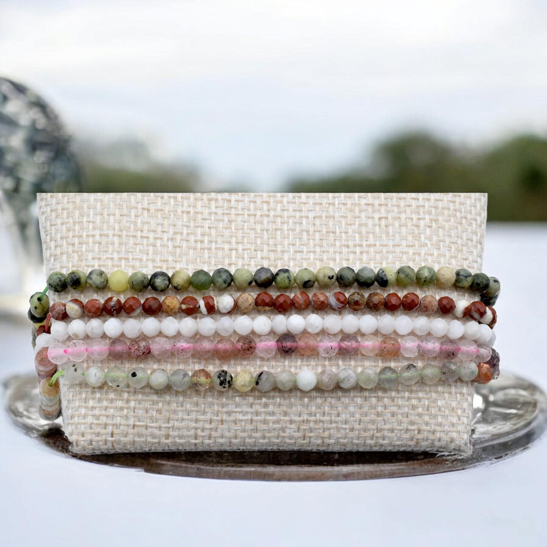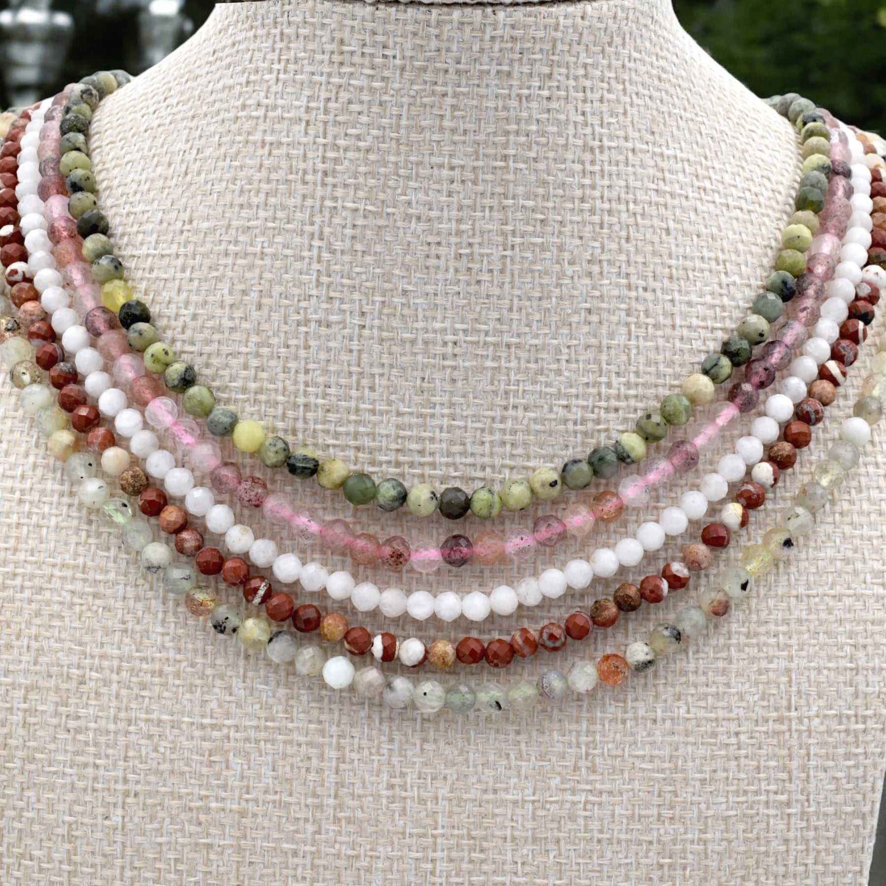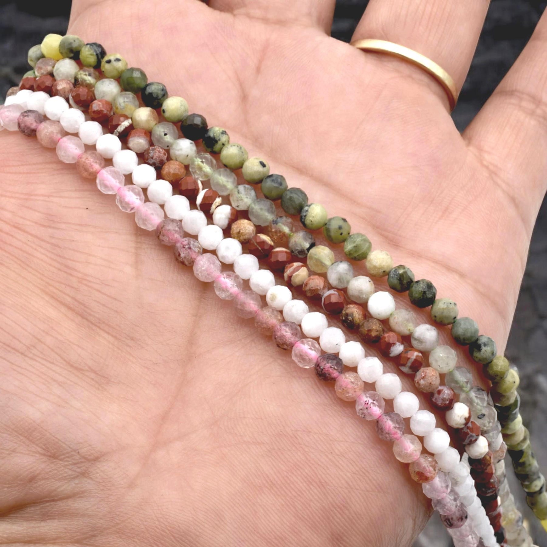Design grounded, nature-inspired jewelry with this strand of 4mm faceted round natural gemstone beads. Featuring a rich mix of earthy tones—olive green, terracotta, creamy white, rose pink, and neutral grays—these semi-precious stones are ideal for rustic, boho, and healing jewelry styles. Each bead is cut with facets to enhance natural shine and depth. Perfect for bracelets, necklaces, earrings, and craft projects.