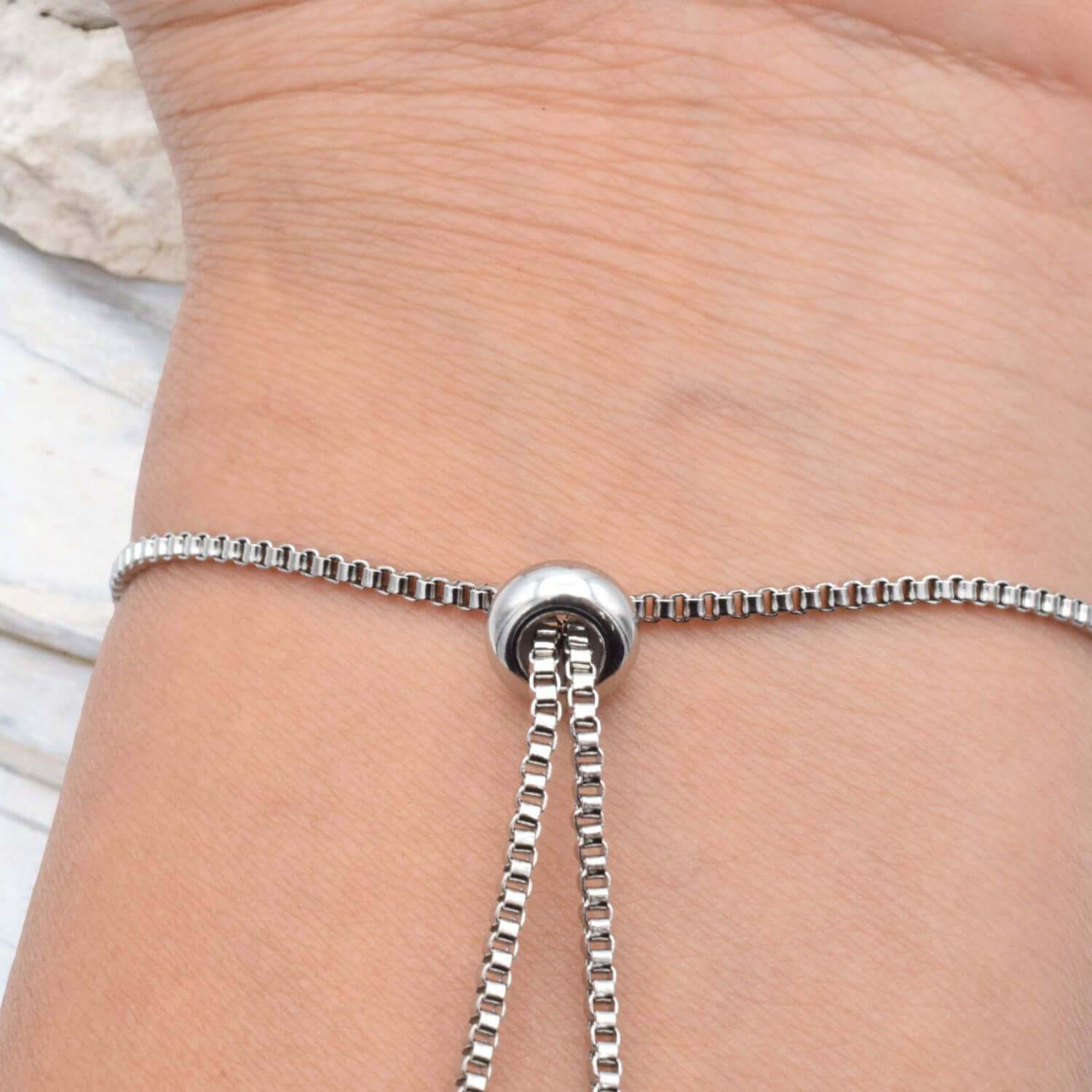 "Adjustable silver-tone bracelet on wrist with sliding clasp"