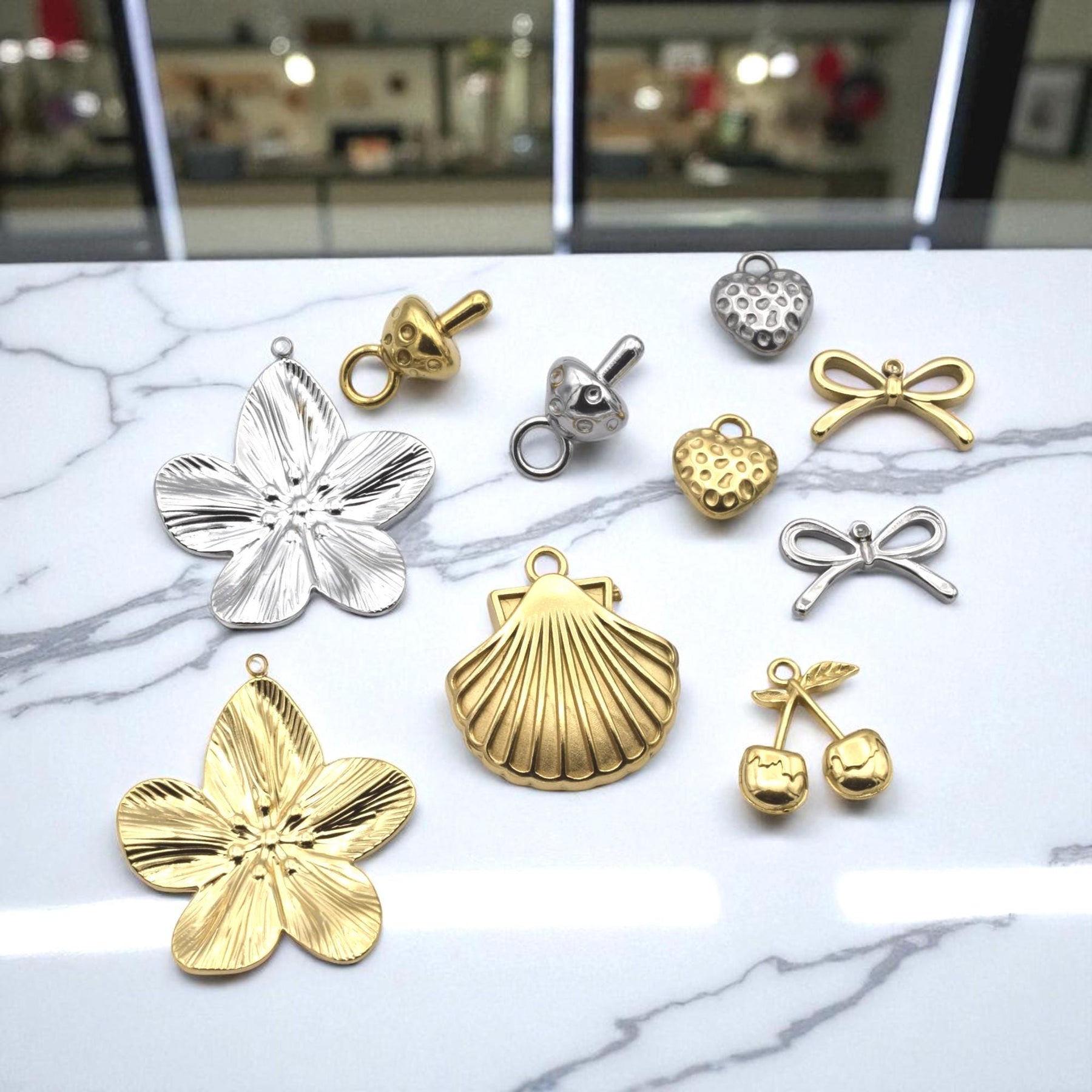 Stainless Steel Gold & Silver Charm Mix – Blossom Flower, Shell, Bow, Textured Heart, Cherry End‑Cap Pendants for DIY Jewe...