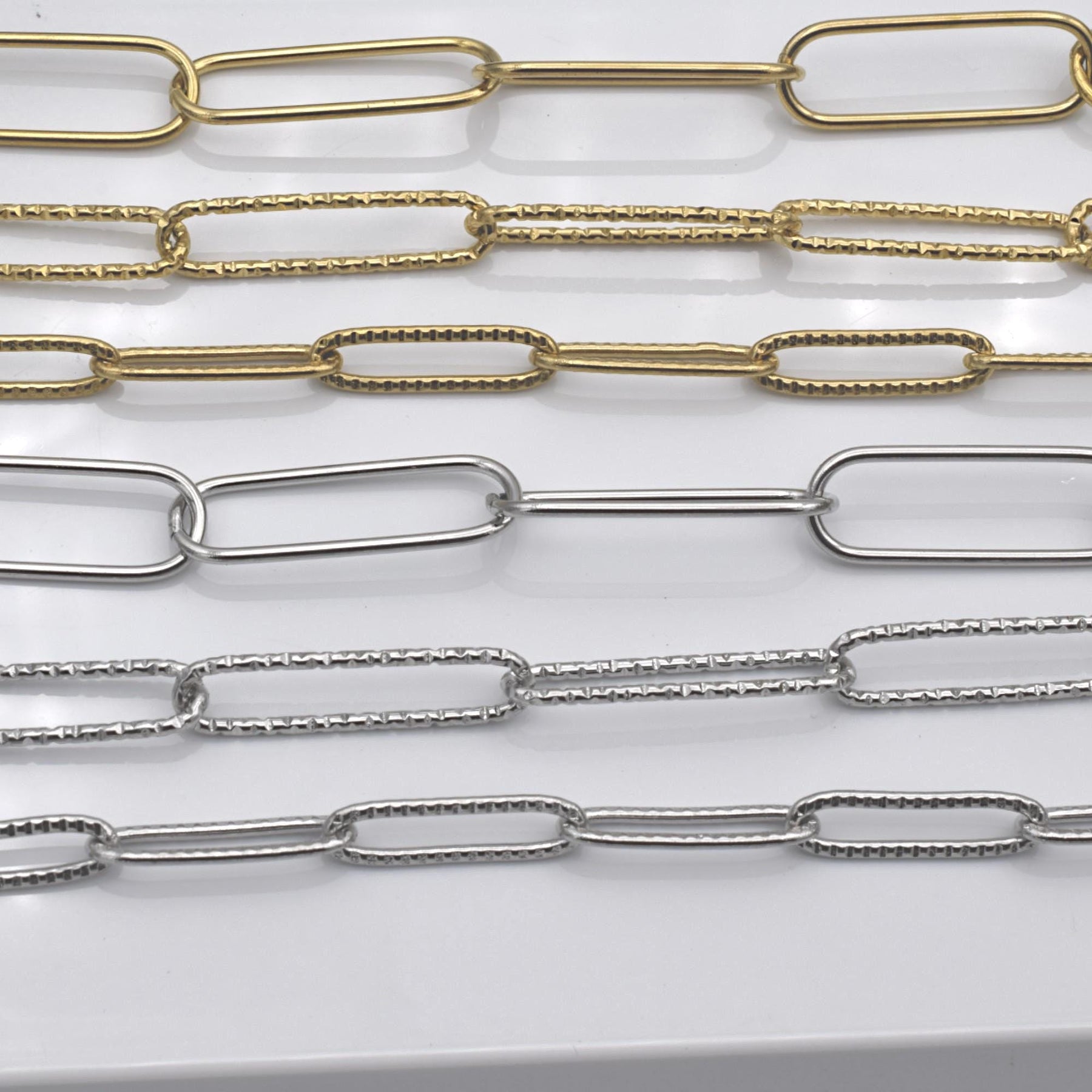 Craft modern and elegant jewelry with our paperclip-style chain links in beautiful gold and silver Stainless-Steel finishes. These elongated rectangular links come in both smooth and hammered/textured styles—perfect for minimalist necklaces, statement bracelets, anklets, or bag straps.