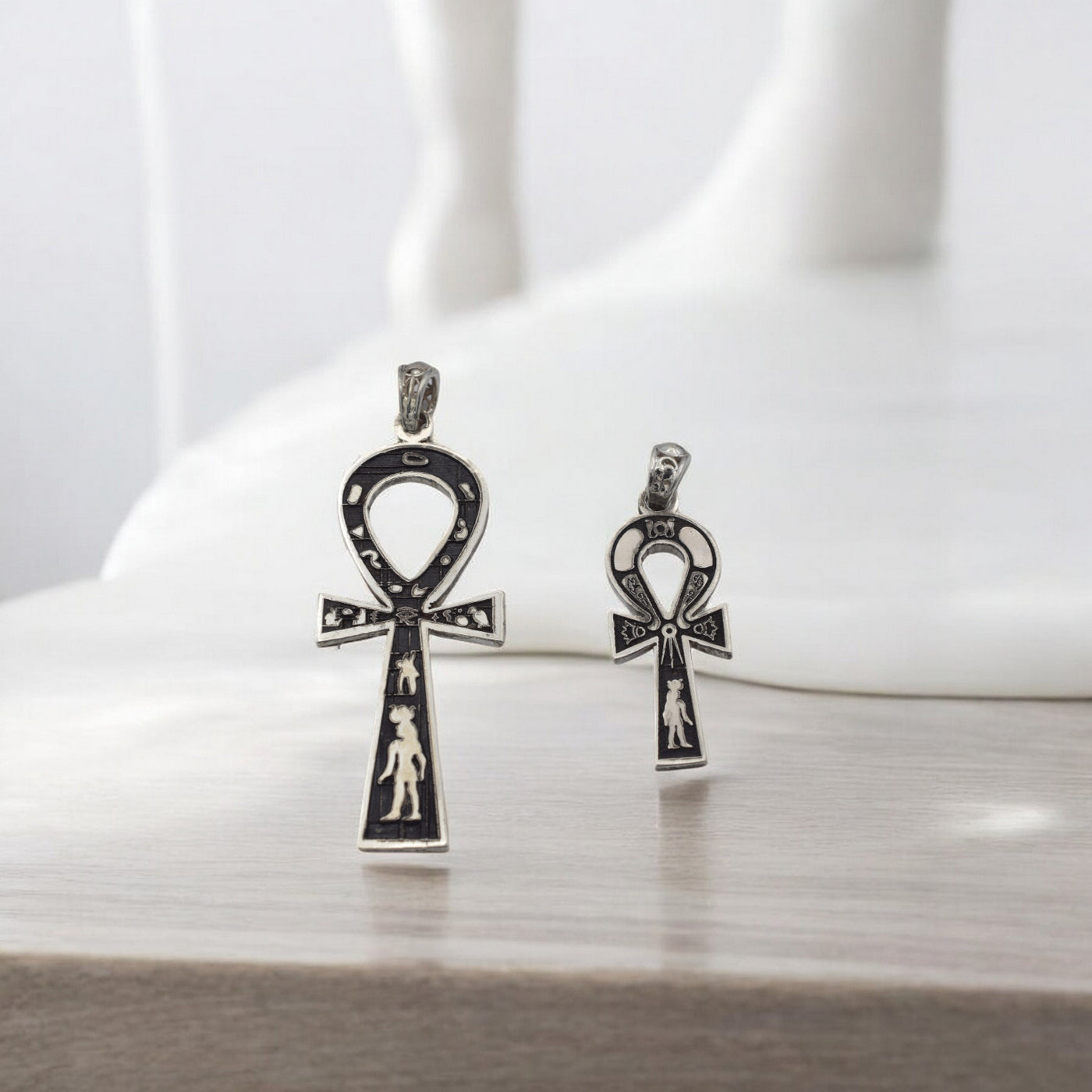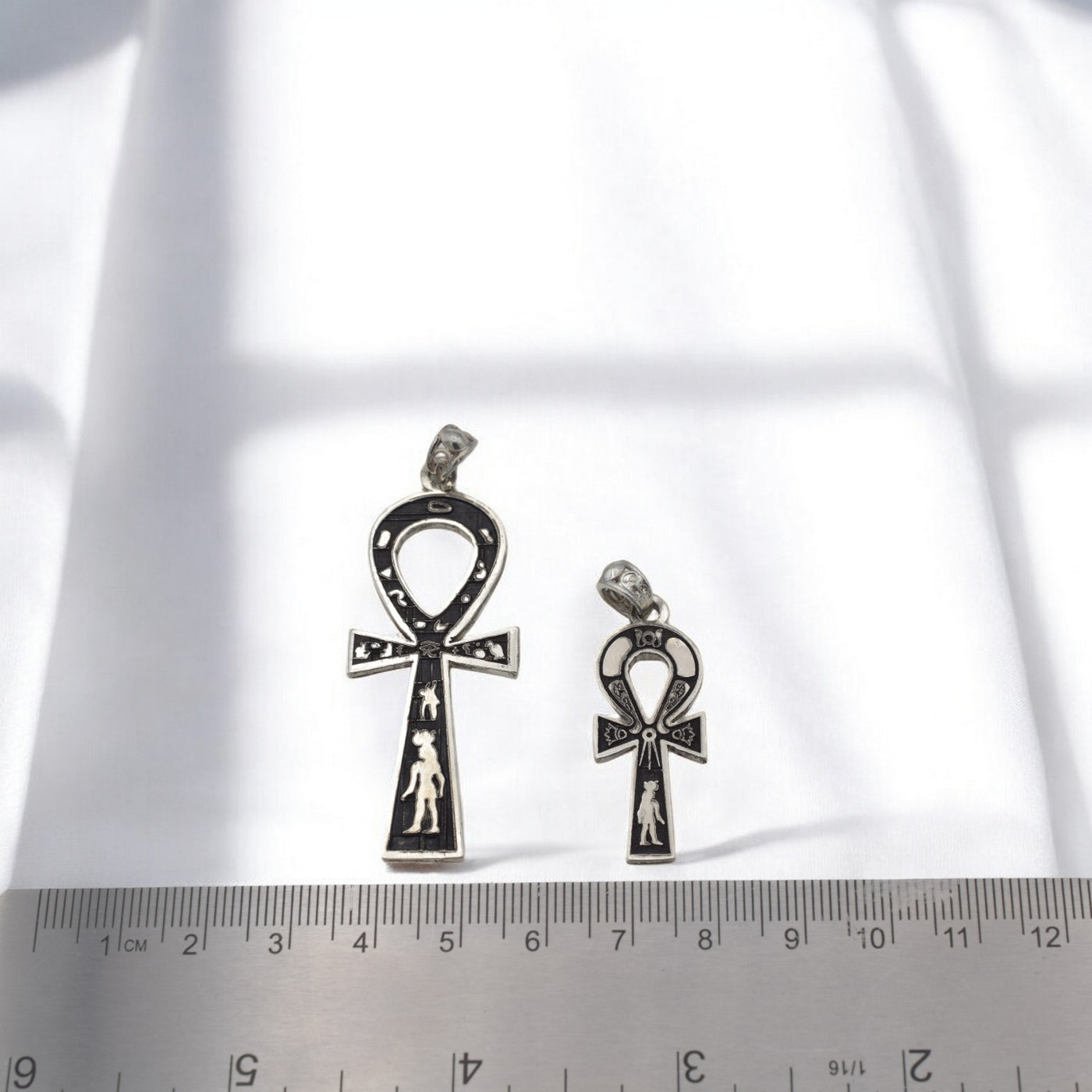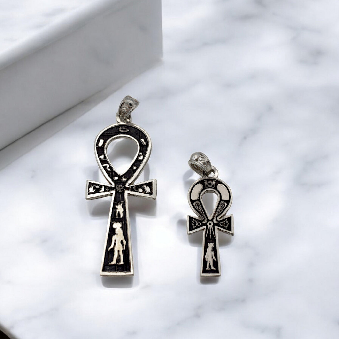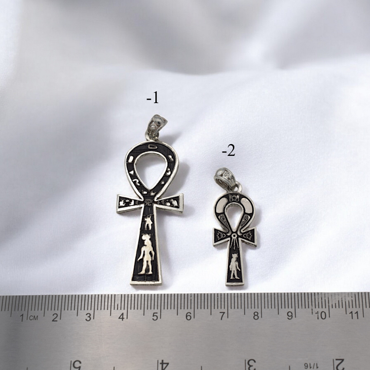 Silver Ankh pendant with detailed engravings on white background.