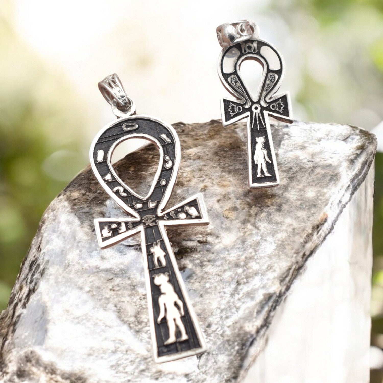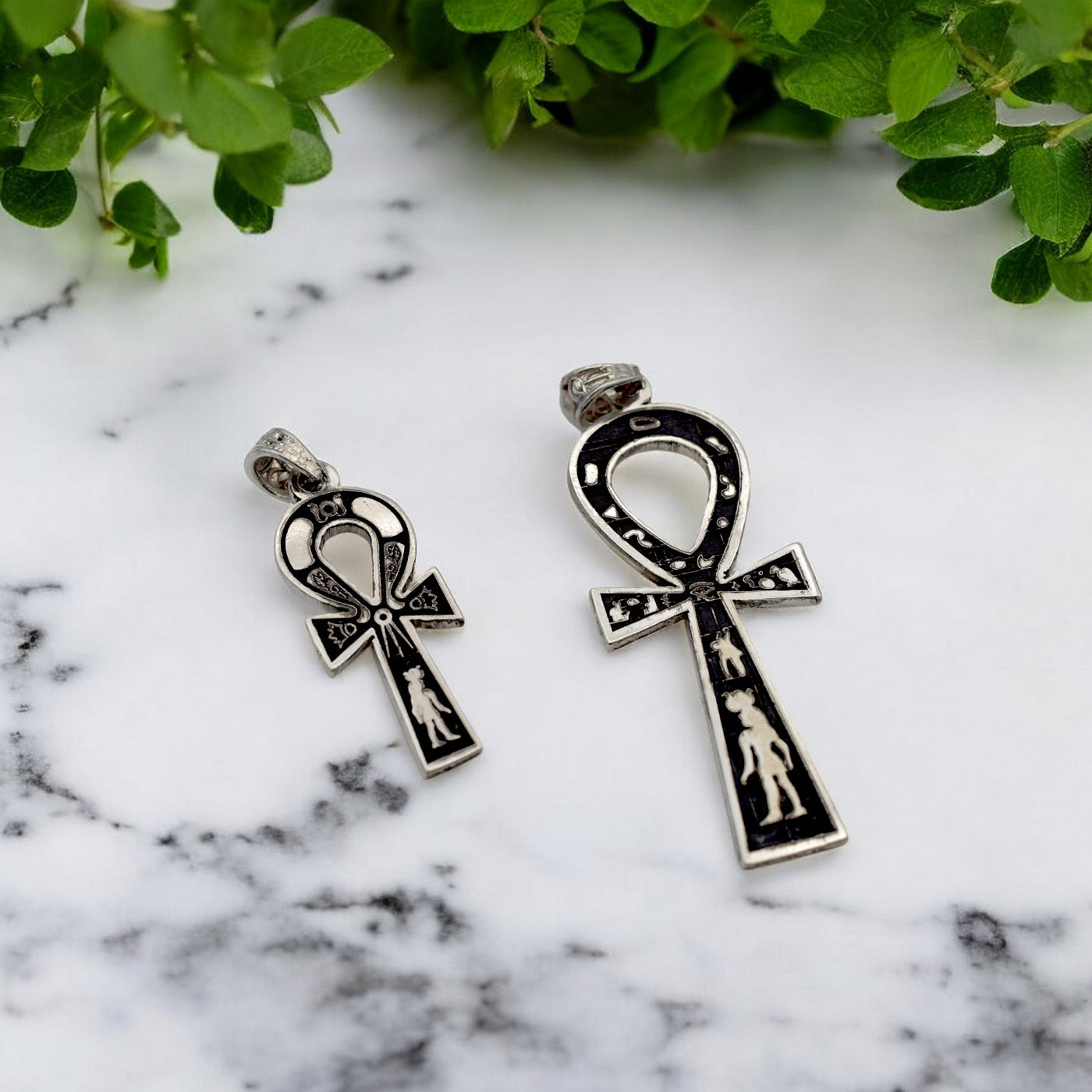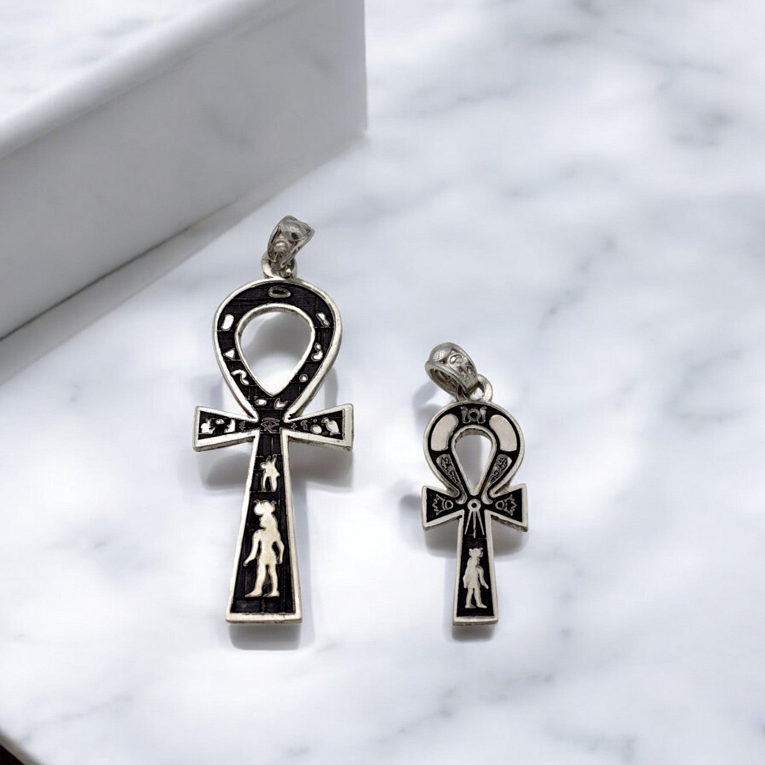 Silver Ankh pendant with detailed engravings on white background.