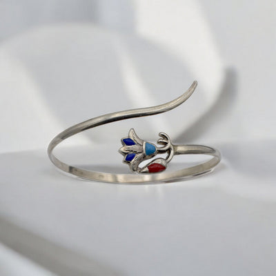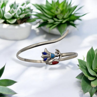 Silver cuff bracelet with multicolored gemstone flower design amidst tulips.