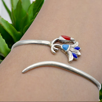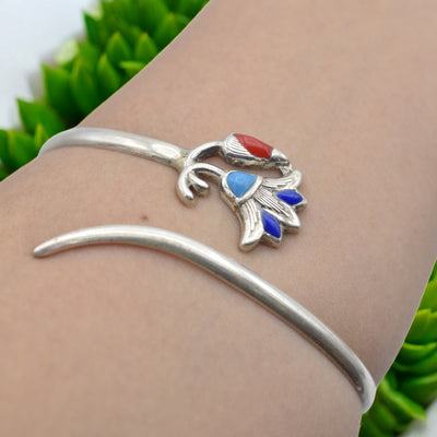 Sterling Silver Lotus Flower Bracelet with Lapis, Turquoise & Coral - Adjustable Cuff