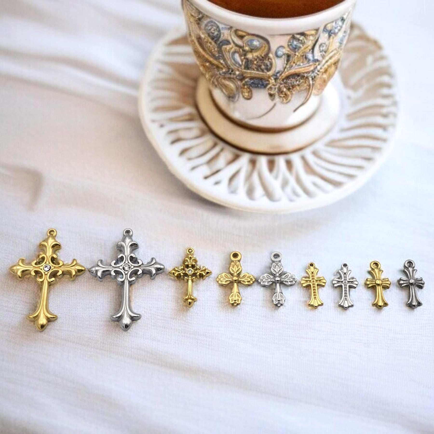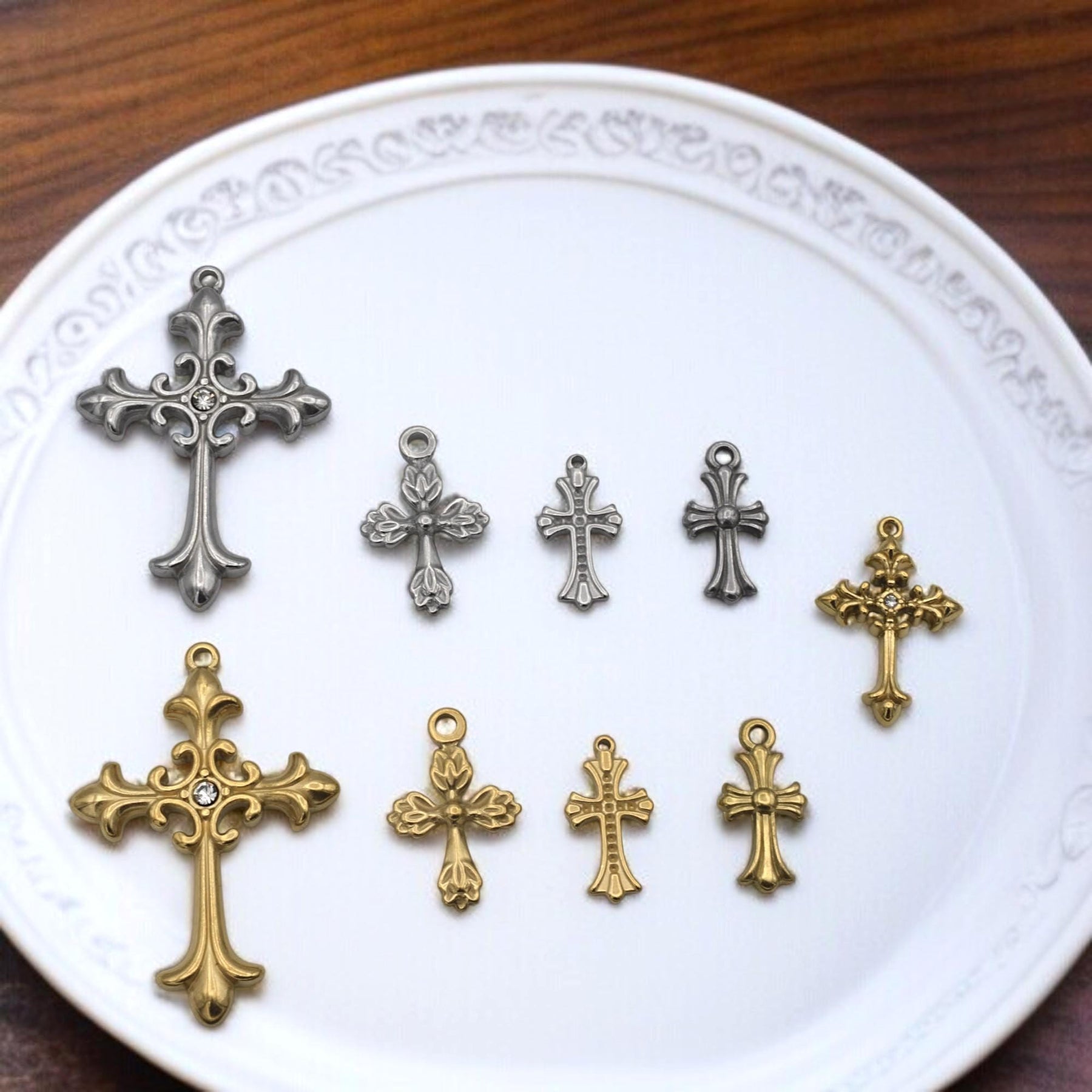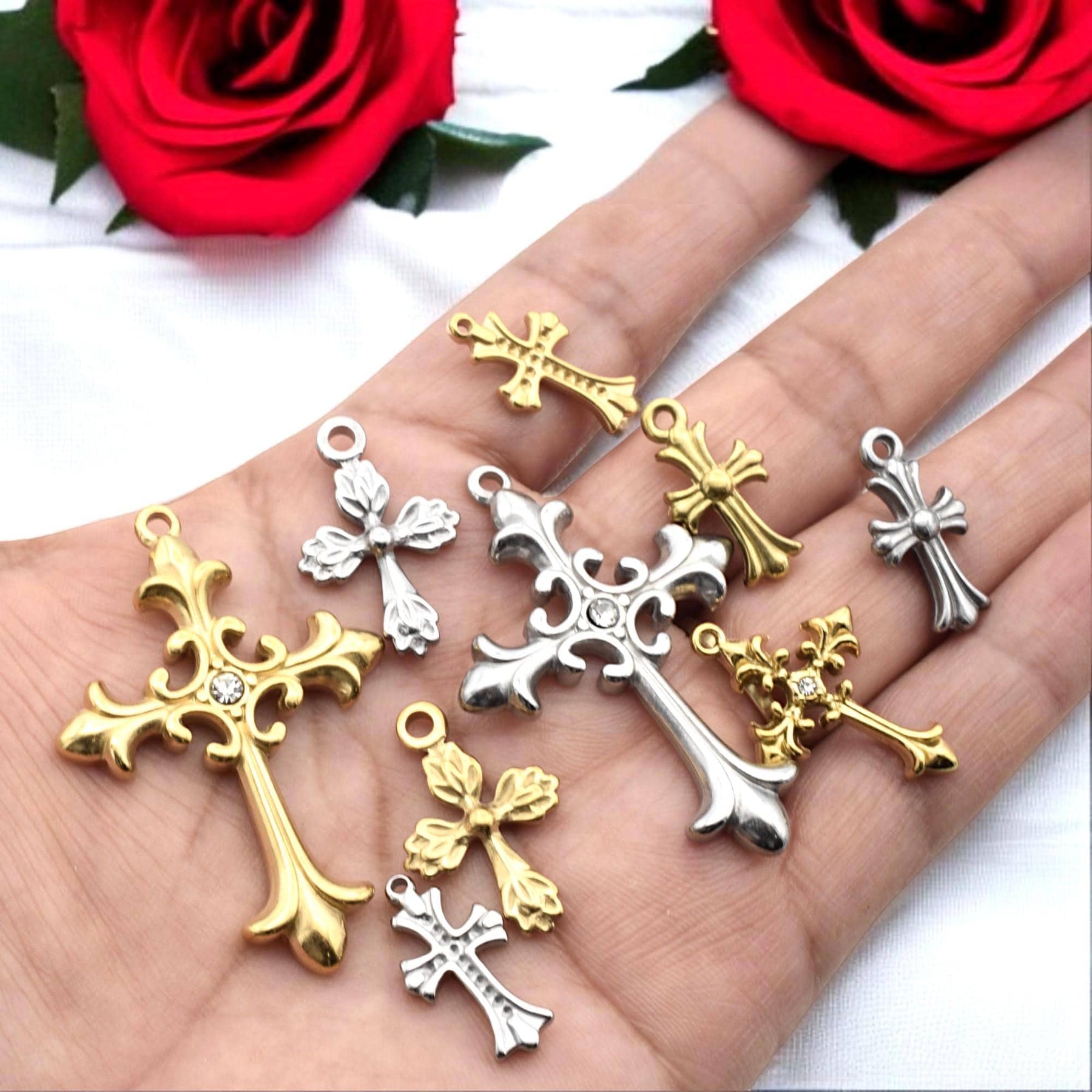 Create meaningful, inspired pieces with this assortment of ornate cross charms in warm gold and cool silver‑tone Stainless Steel. Each charm features elegant filigree details—two large focal crosses accented by sparkling rhinestones plus eight matching mini crosses for layering or rosary repair.