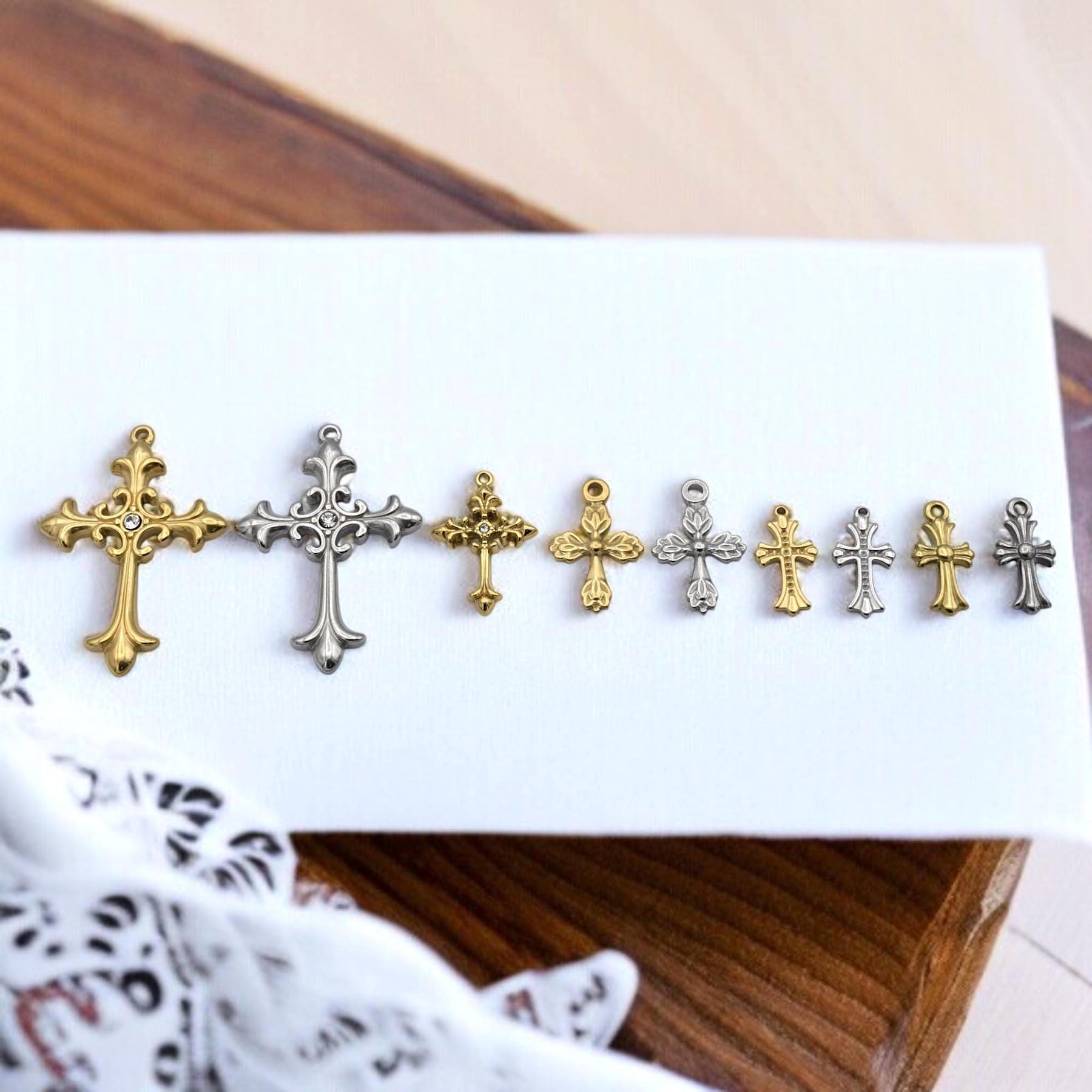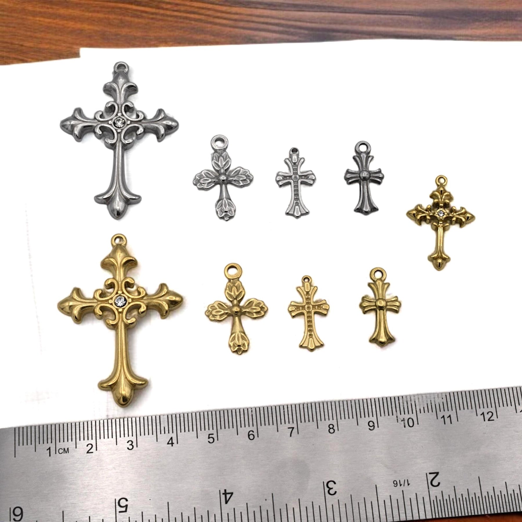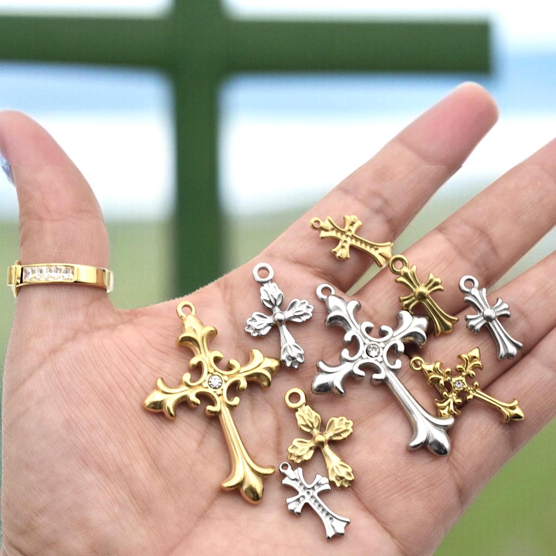 Create meaningful, inspired pieces with this assortment of ornate cross charms in warm gold and cool silver‑tone Stainless Steel. Each charm features elegant filigree details—two large focal crosses accented by sparkling rhinestones plus eight matching mini crosses for layering or rosary repair.