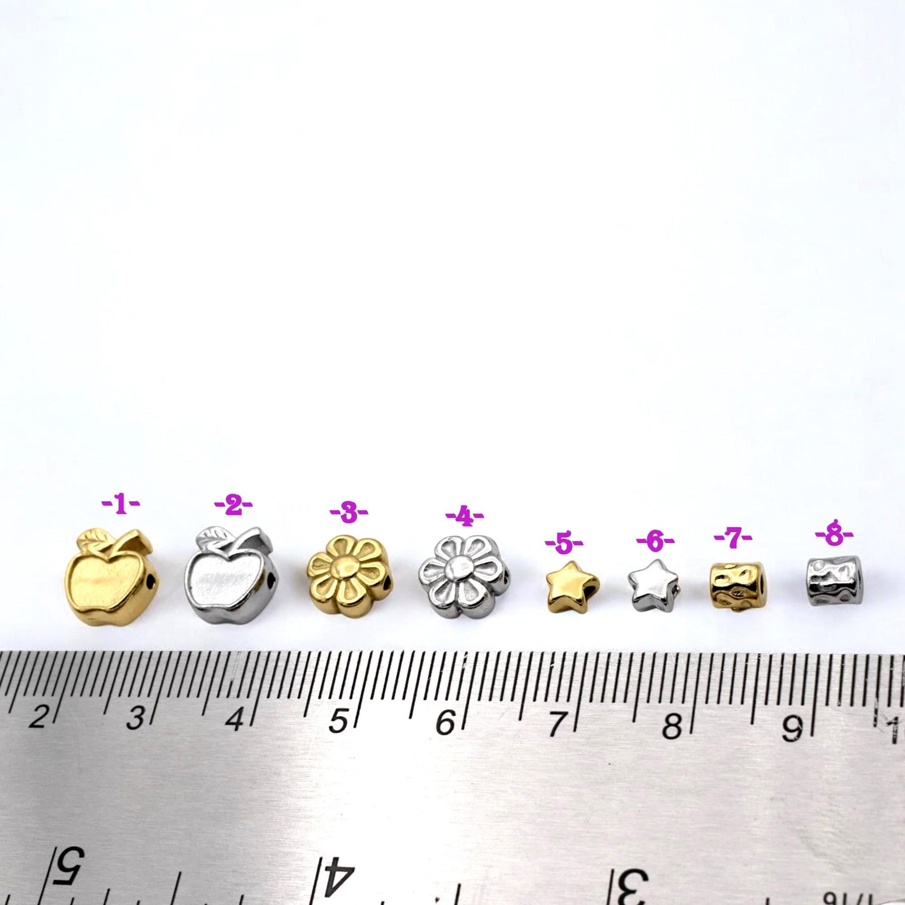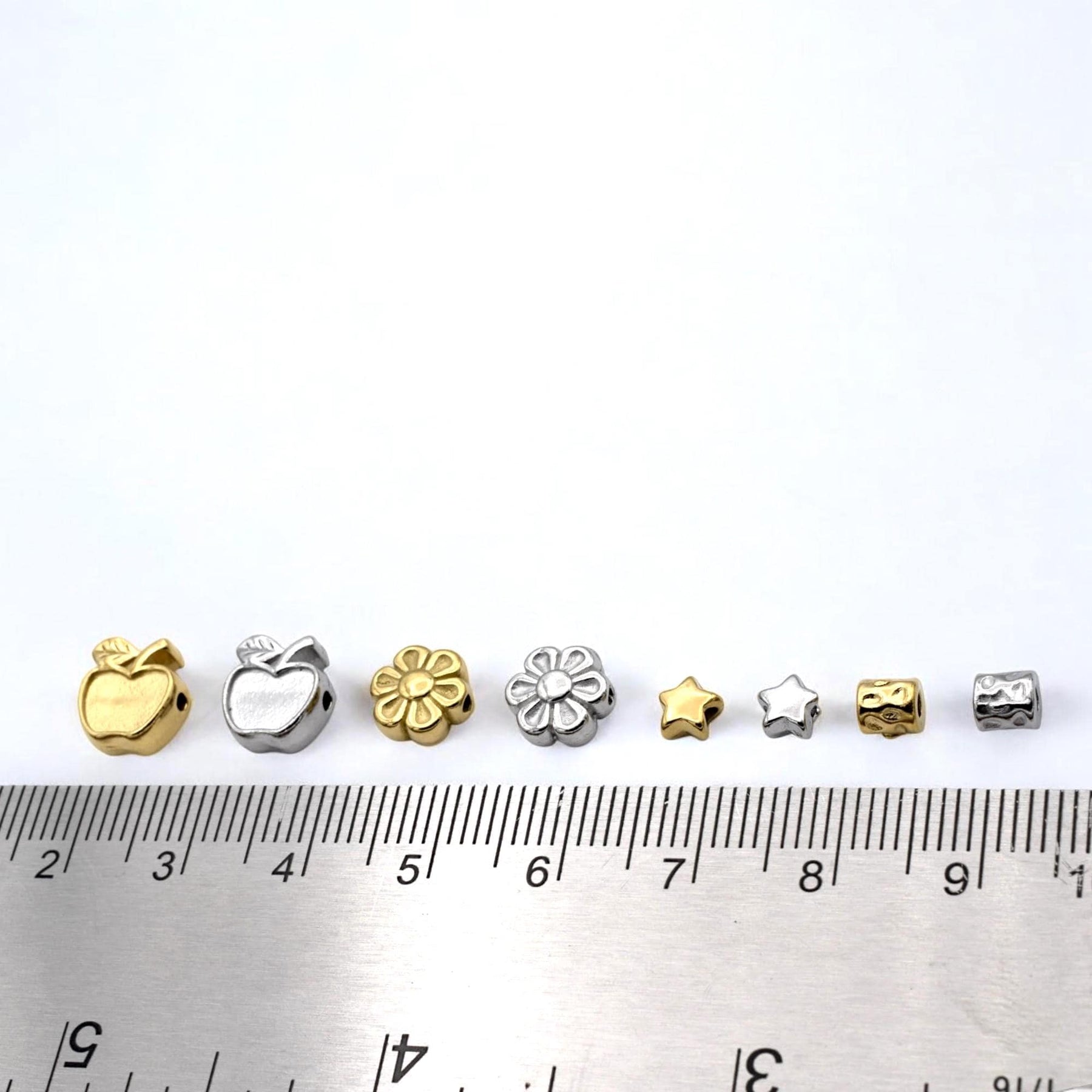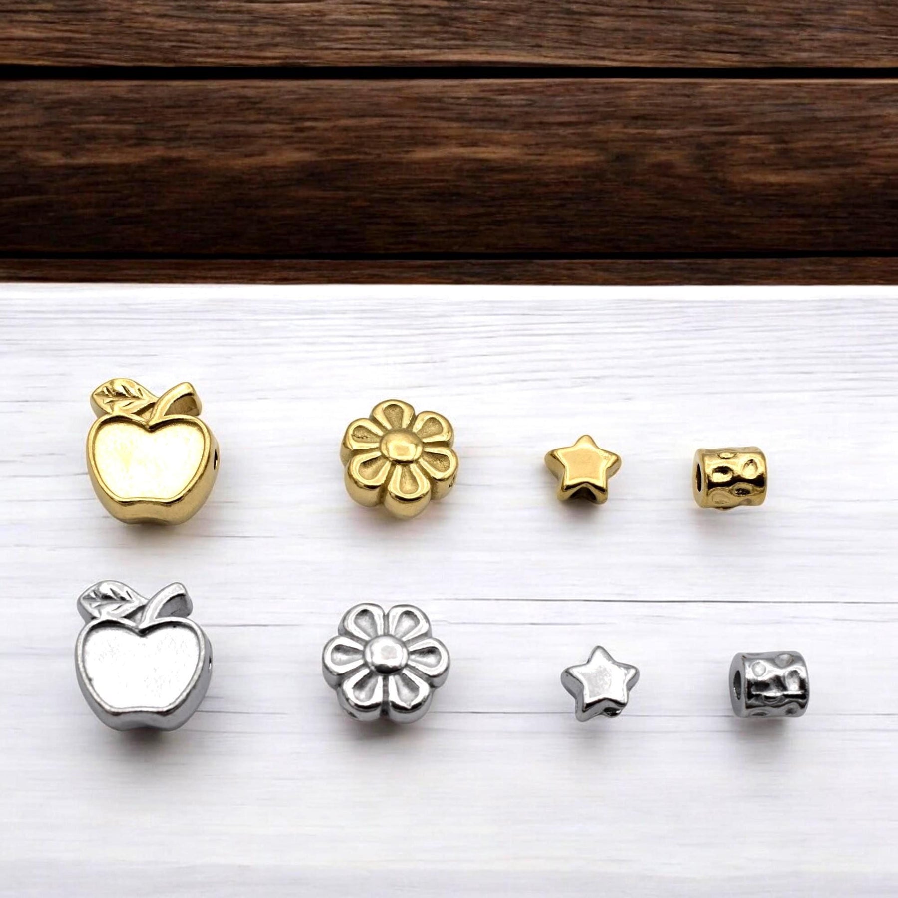Stainless Steel Charm Bead Spacer - Apple, Flower Daisy, Star, Barrel - Gold /Silver‑Tone for DIY Jewelry, Bracelet, Necklace, Hair 12PCs/PK