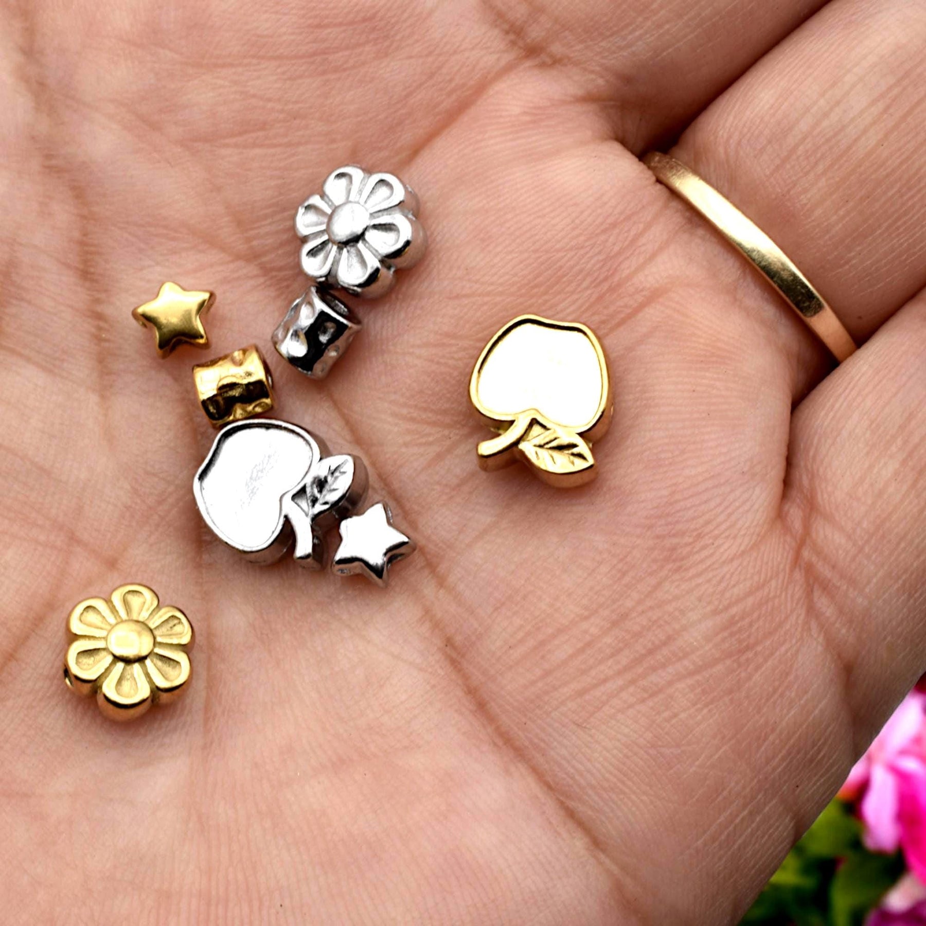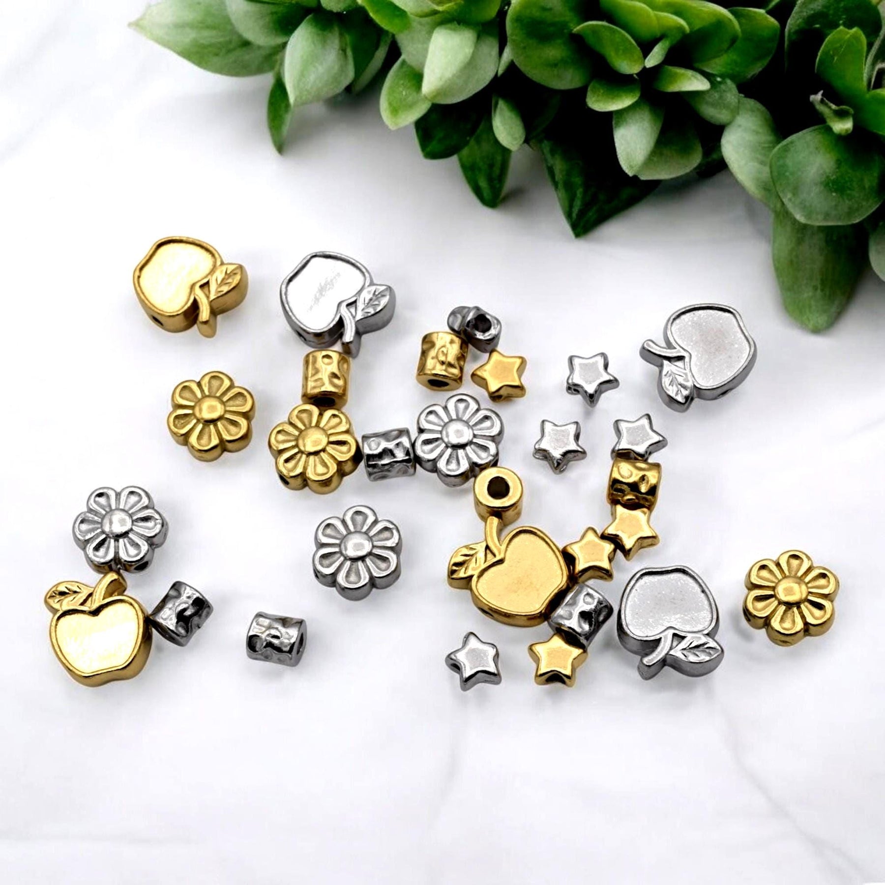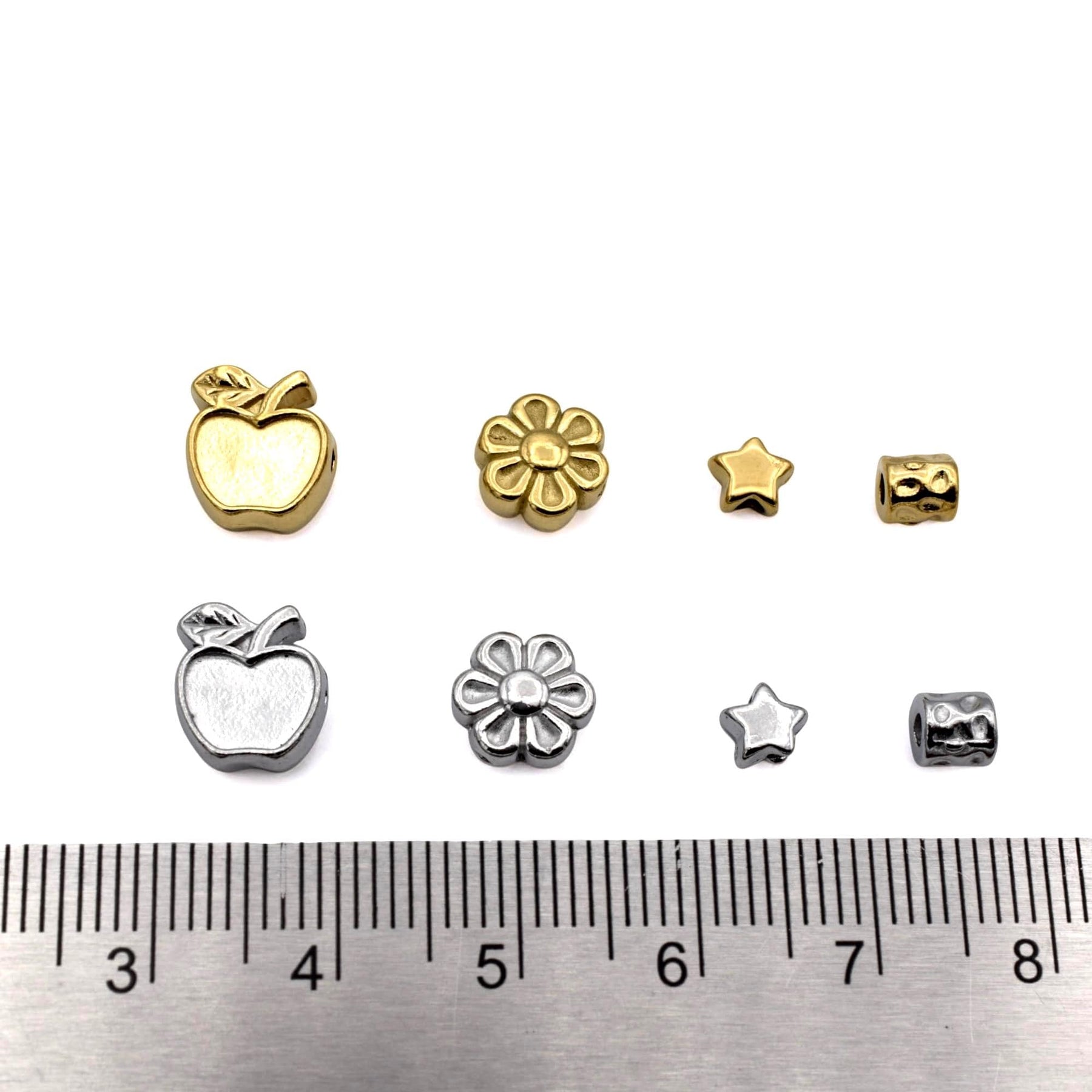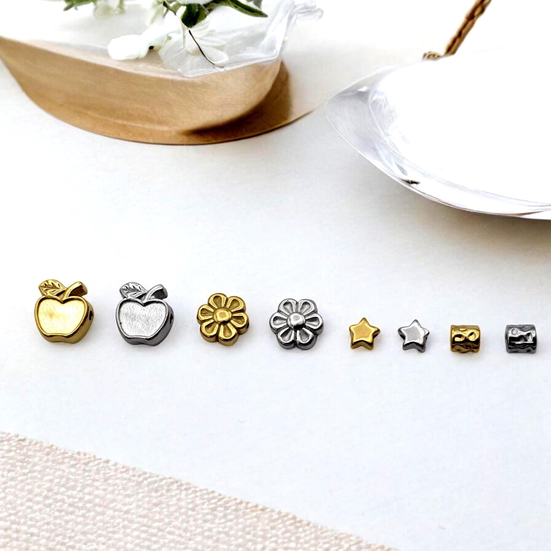 Stainless Steel Charm Bead Spacer - Apple, Flower Daisy, Star, Barrel - Gold /Silver‑Tone for DIY Jewelry, Bracelet, Necklace, Hair 12PCs/PK