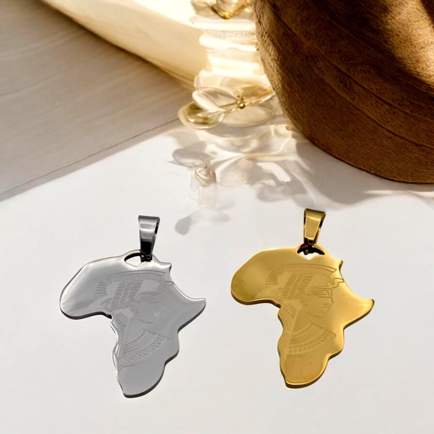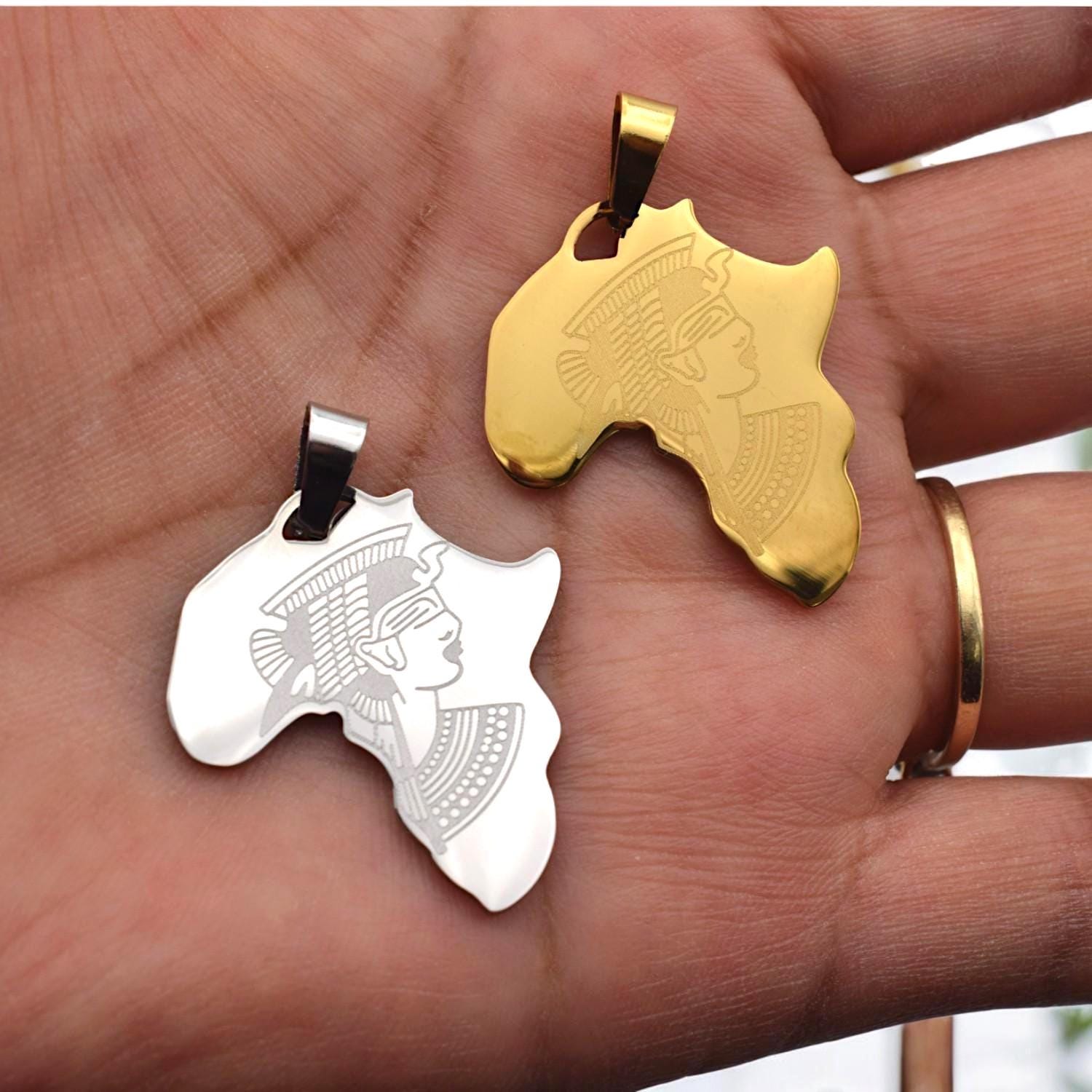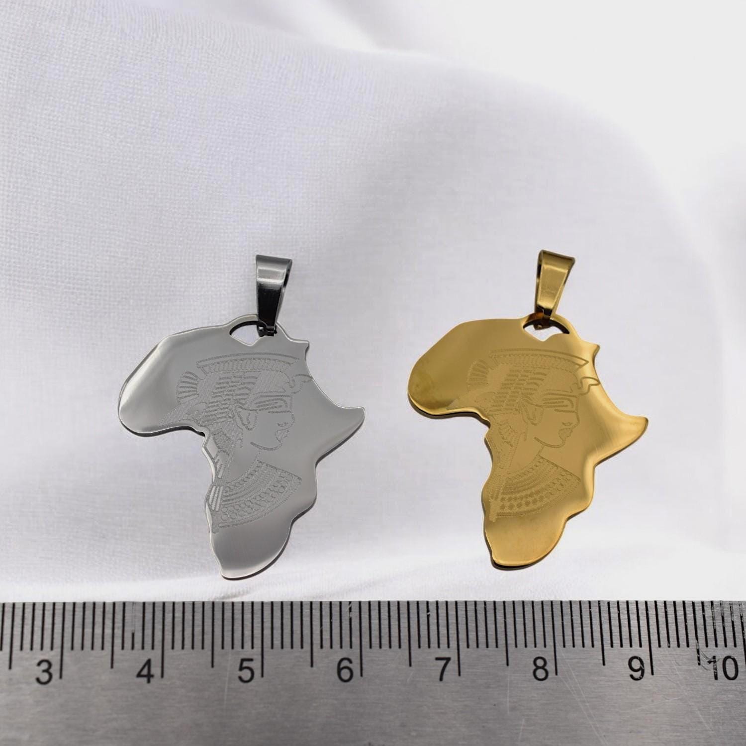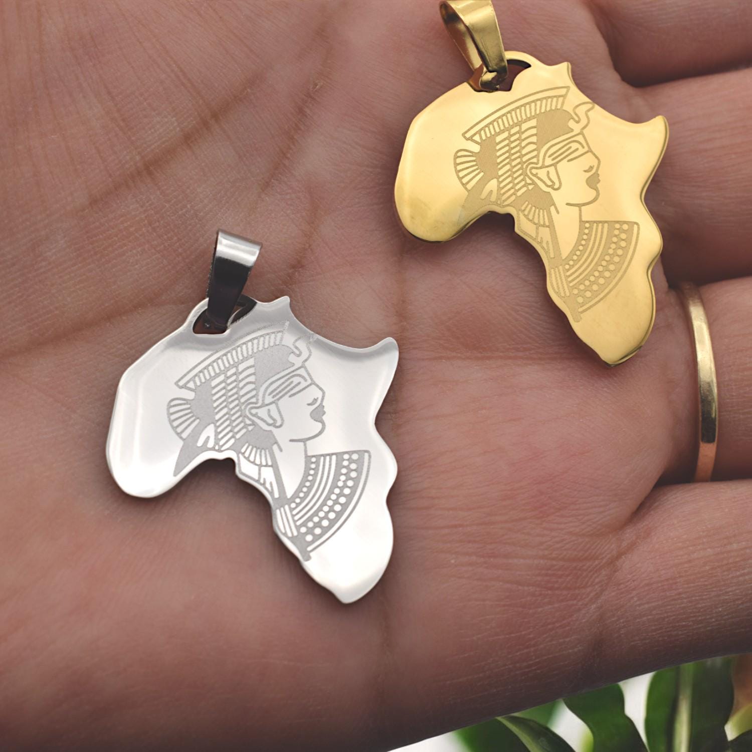 Africa Map Pendant with Cleopatra Laser Engraving – Stainless Steel Charm, Gold/Silver Tone, Afrocentric Necklace Pendant,...