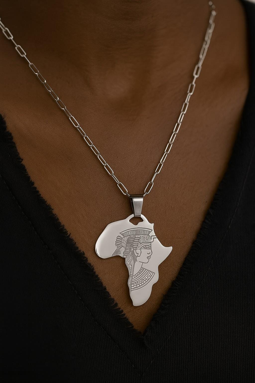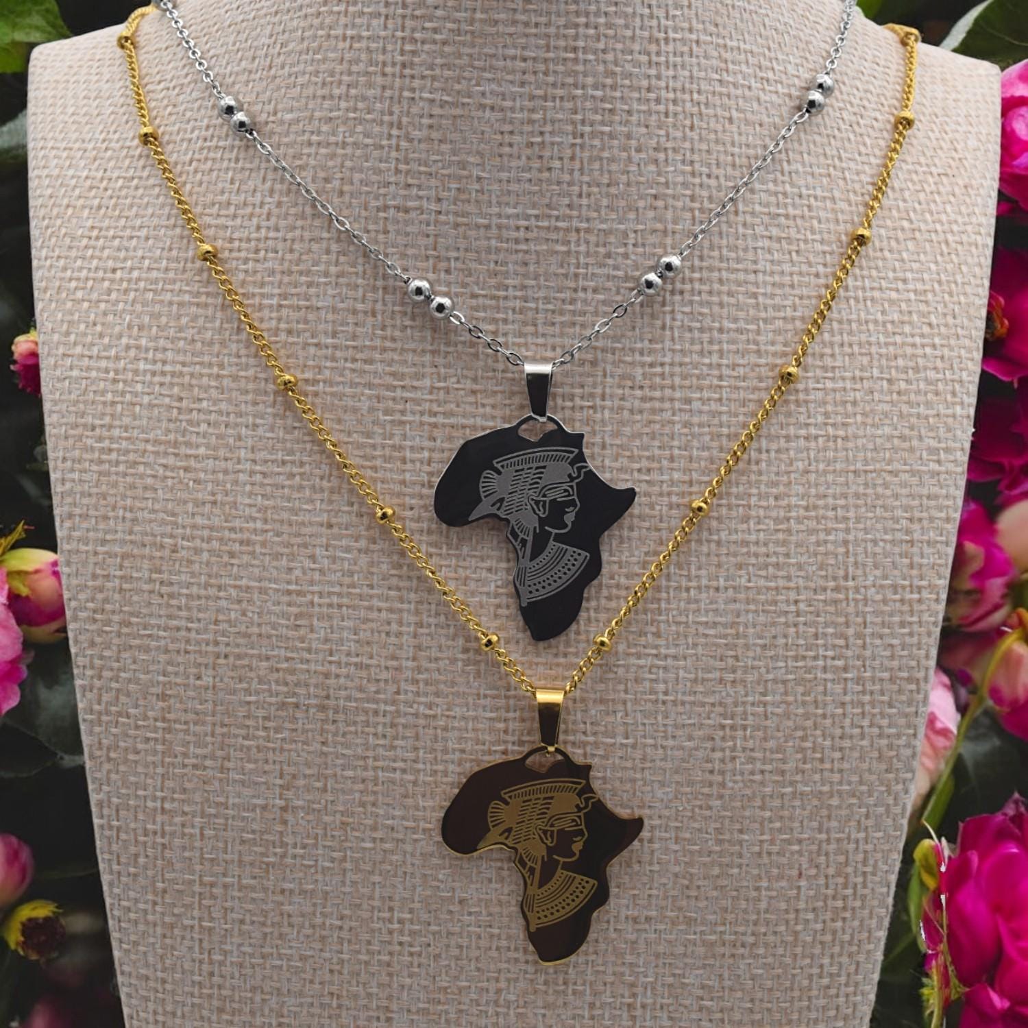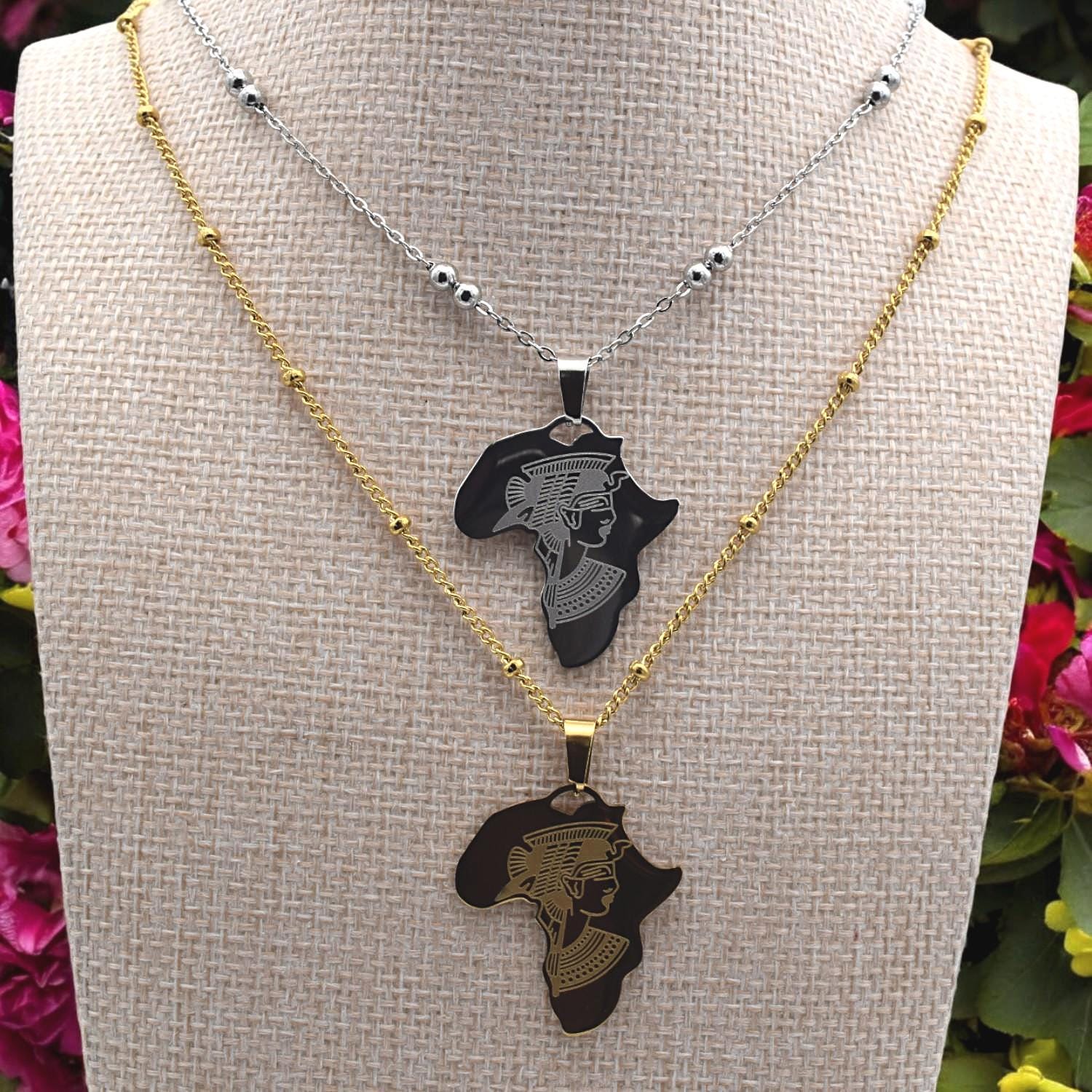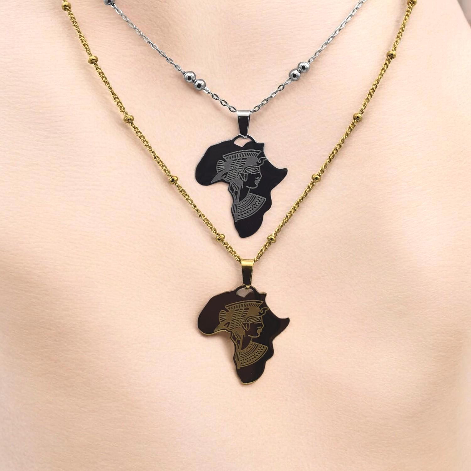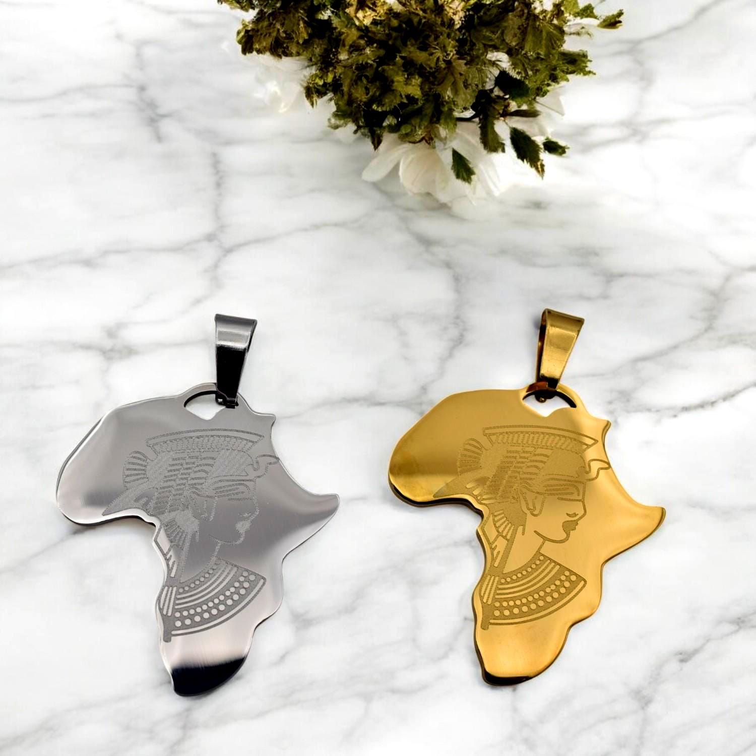 Africa Map Pendant with Cleopatra Laser Engraving – Stainless Steel Charm, Gold/Silver Tone, Afrocentric Necklace Pendant,...