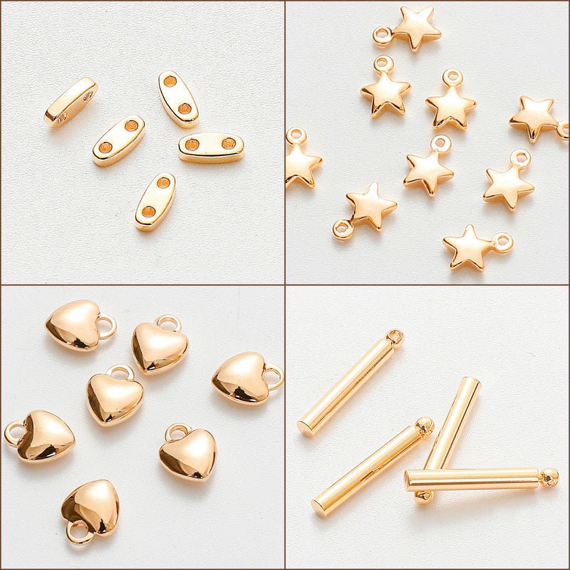 Our 18K gold filled charm beads offer a premium solution for jewelry makers seeking durable and stylish components. These gold filled necklace findings are crafted with water resistant jewelry beads that maintain their shine and quality over time. Featuring charm ending necklace beads in heart and star designs, these gold plated copper charms provide both elegance and resilience for your creations.