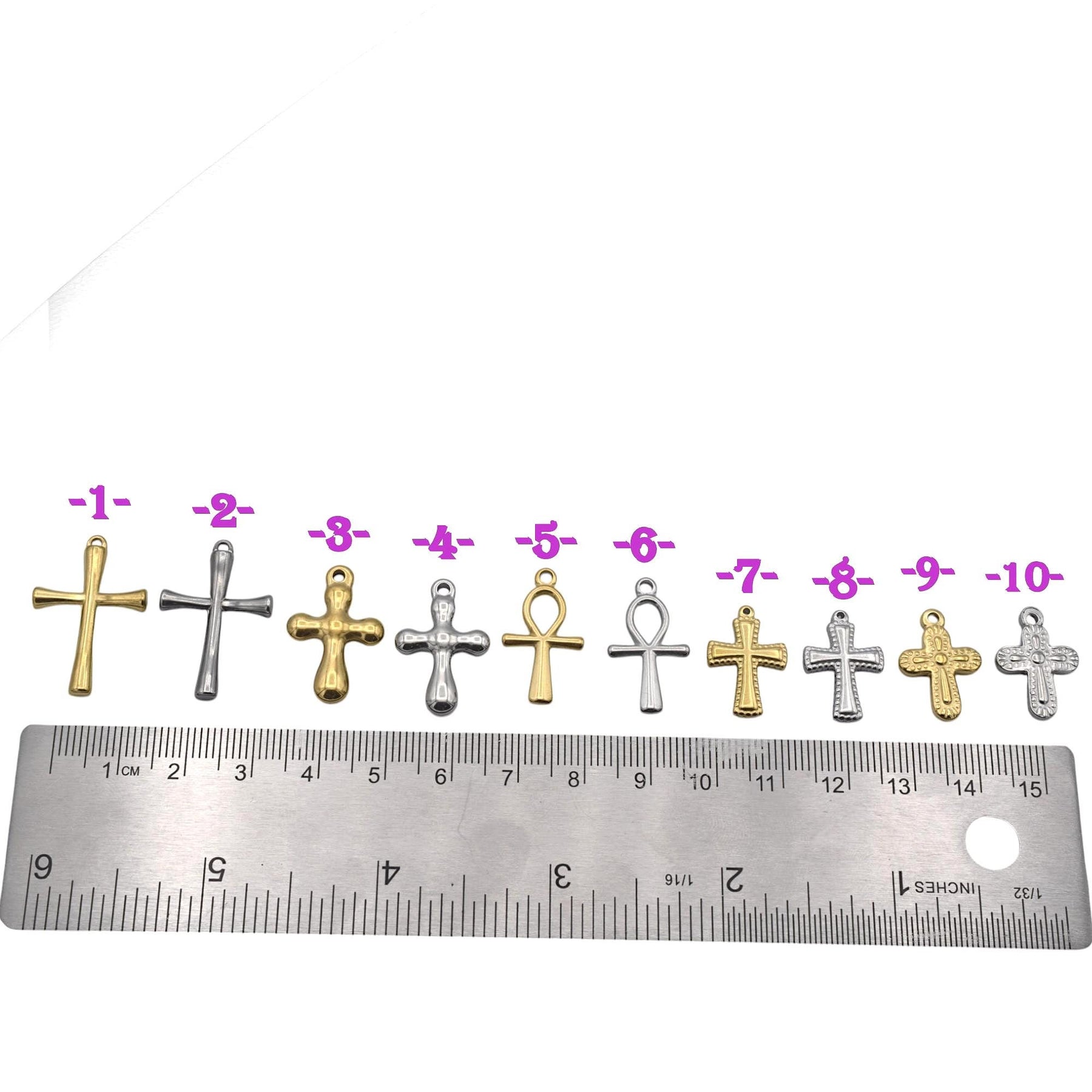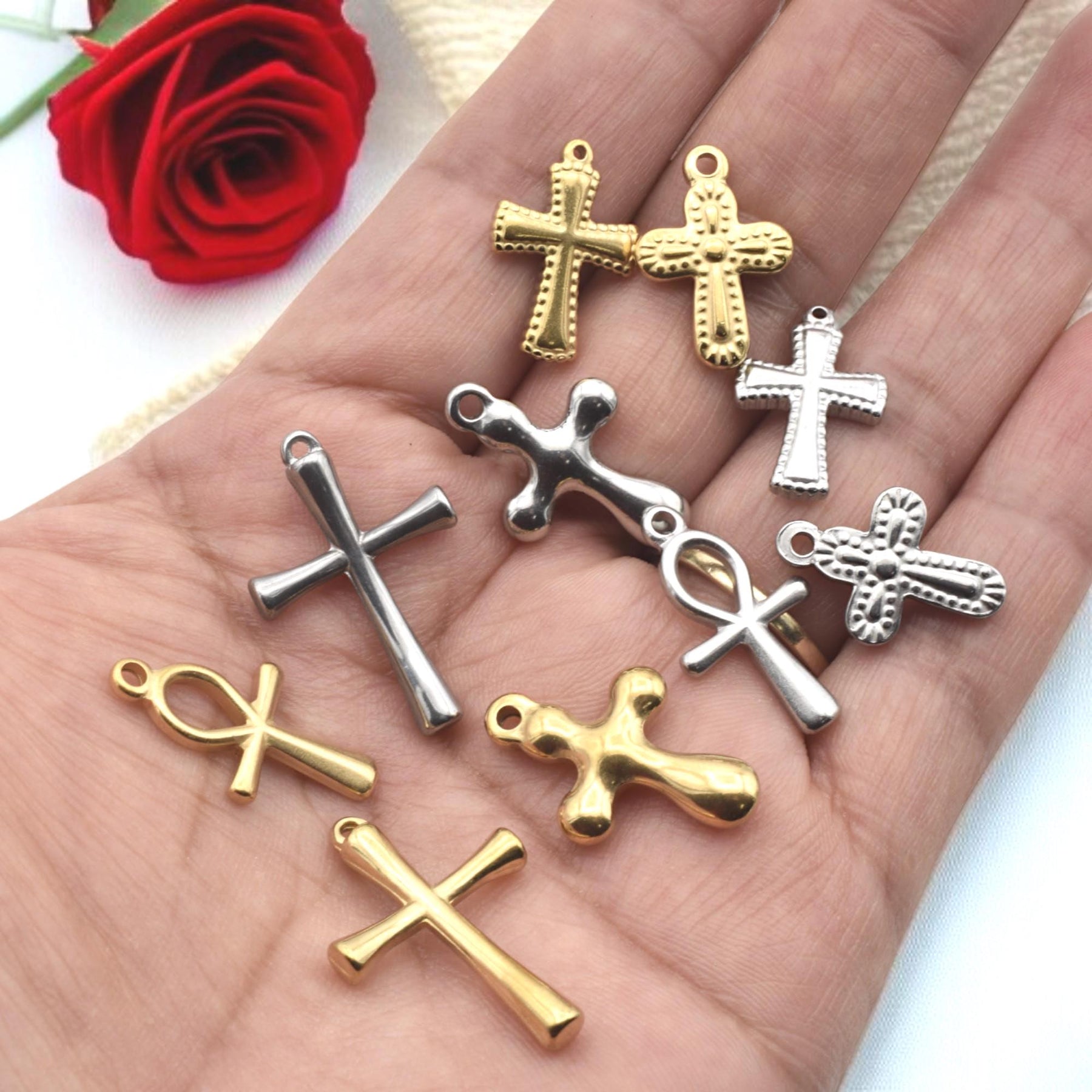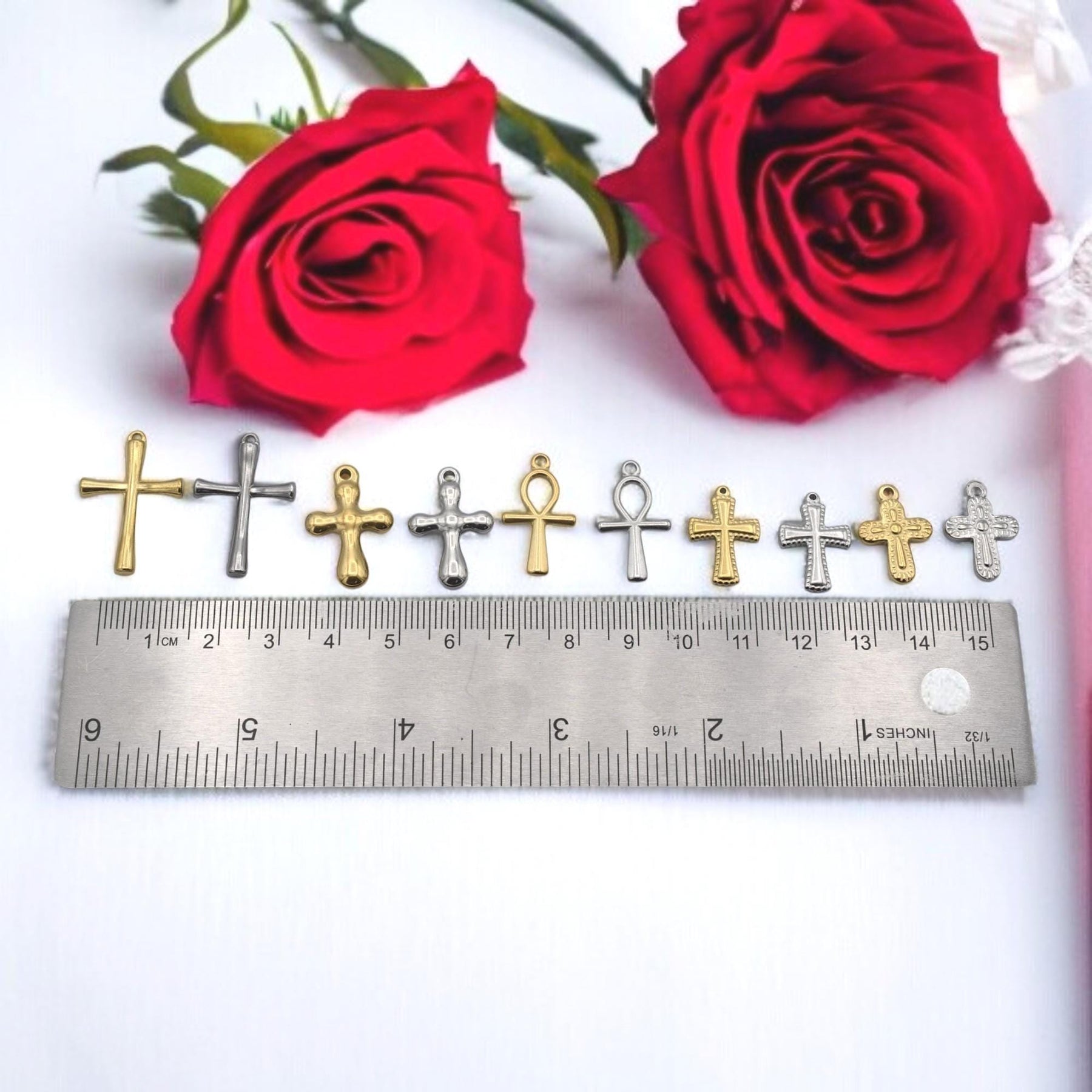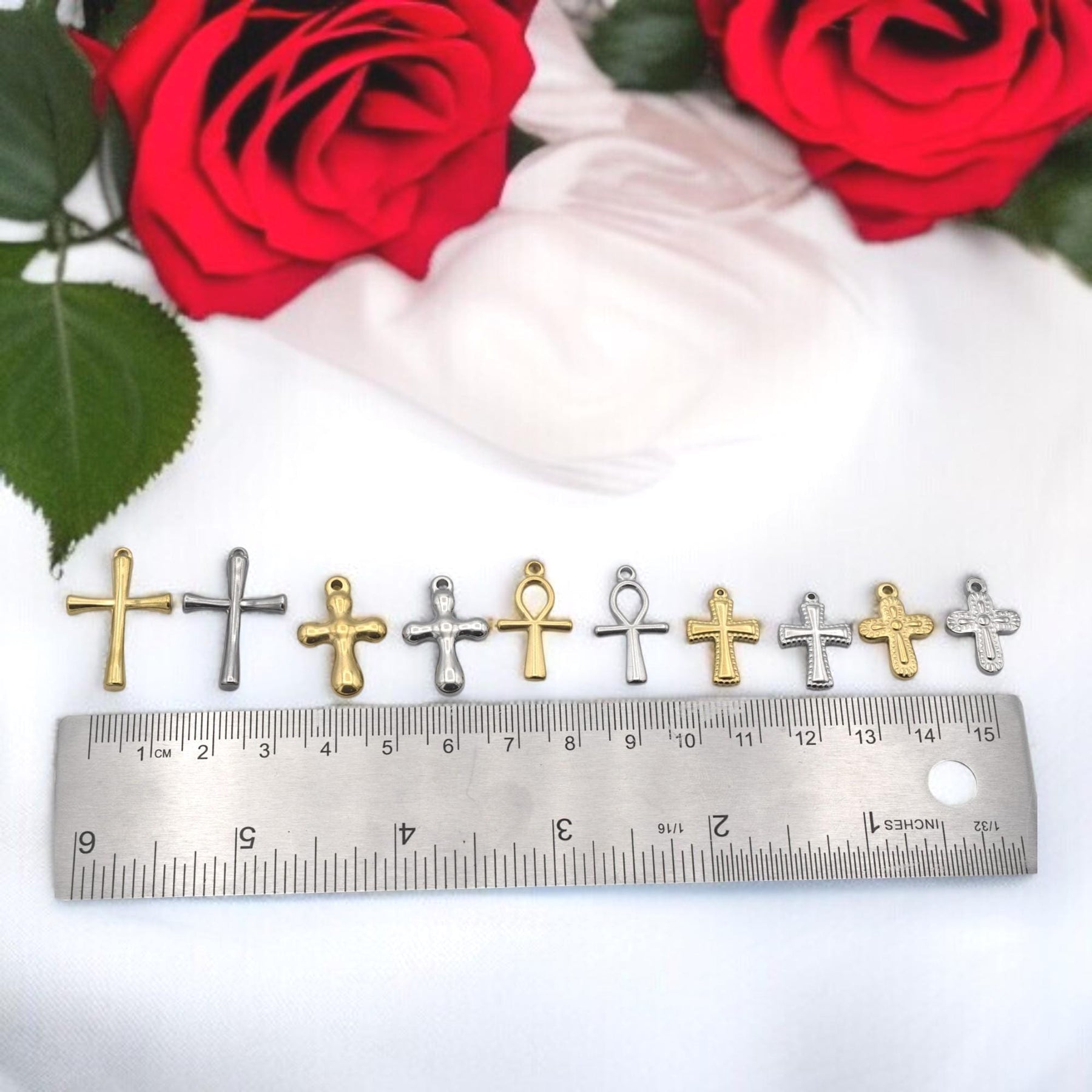 Gold or Silver Stainless Steel Cross and Egyptian Ankh Charm – 12pcs/ pk Religious Pendant Findings - DIY Jewelry Rosary, Necklace, Bracelet