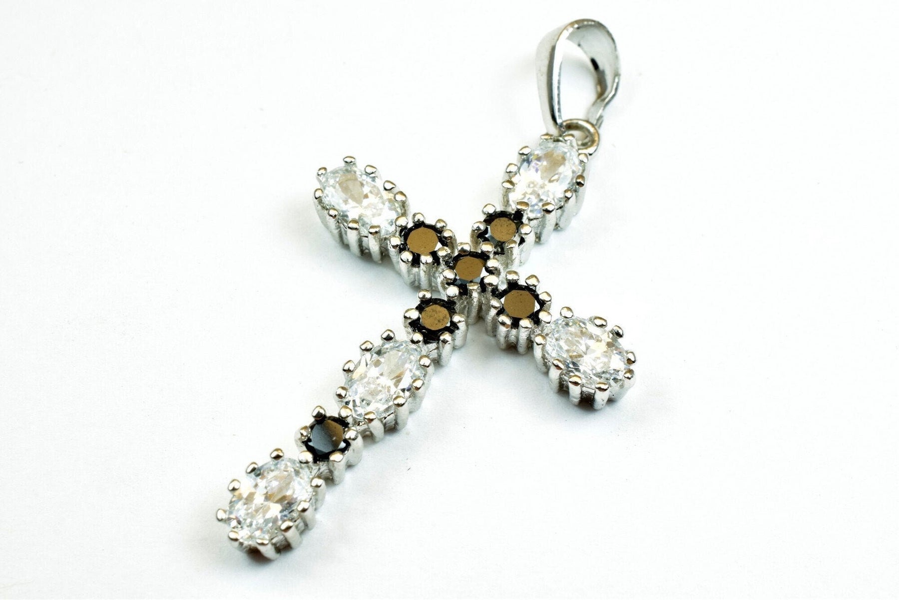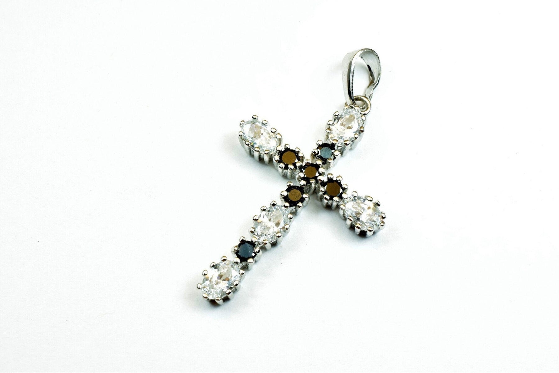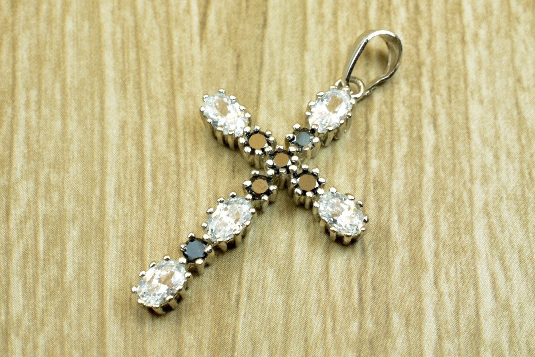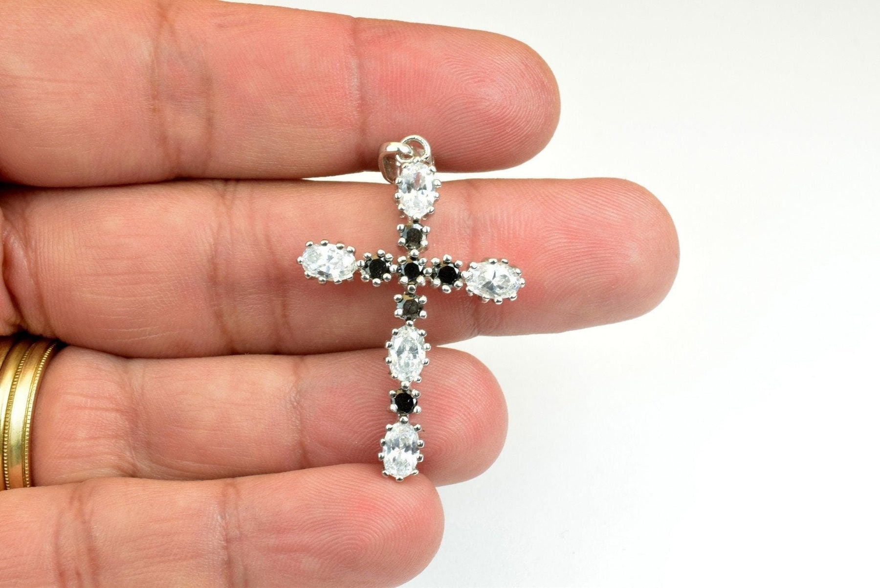 White Gold Filled Look, cross pendant, black clear cz cubic zirconia rhodium plated charm size 39x20mm thickness 4.5mm jew...